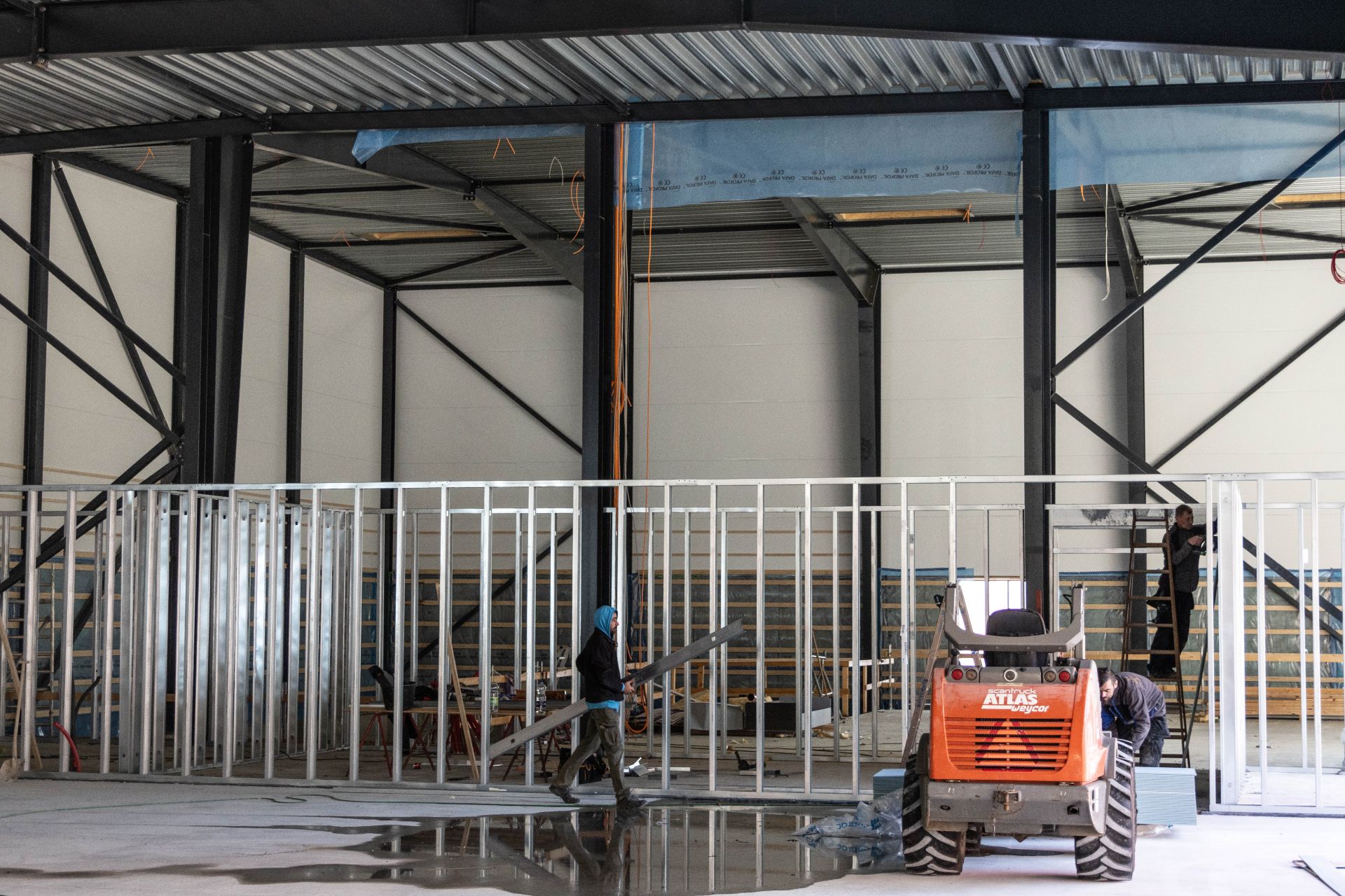 Håndværkerne er rigtig godt i gang med den indvendige opbygning af det nye idrætscenter. Her er de igang med at lave boldrum. Foto: Jim Hoff