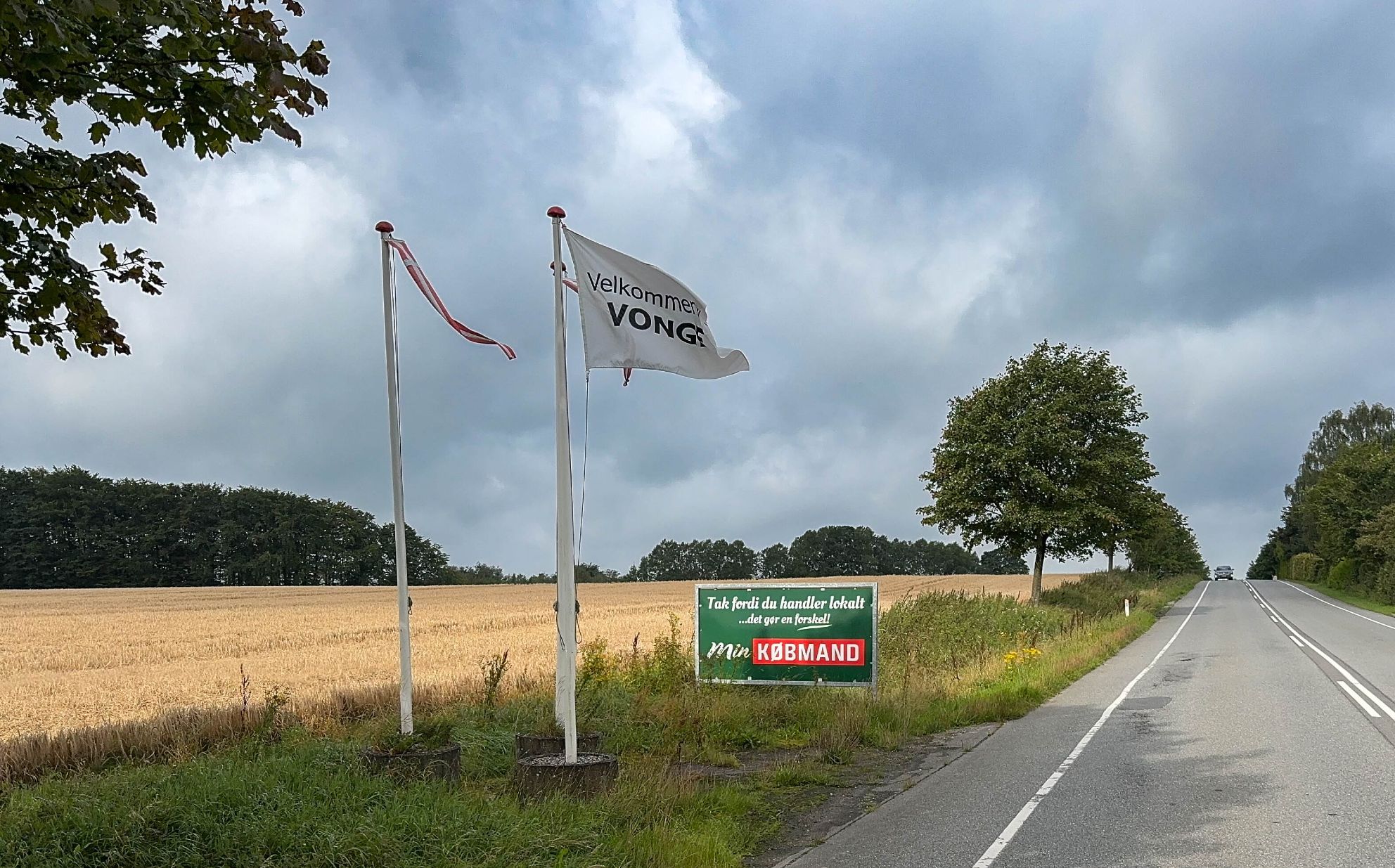 Skiltet ved indkørslen til Vonge fortæller vist det hele. Borgernes opbakning til Mion KØbmand er altafgørende for bútikkens ve og vel.Foto: Jim Hoff