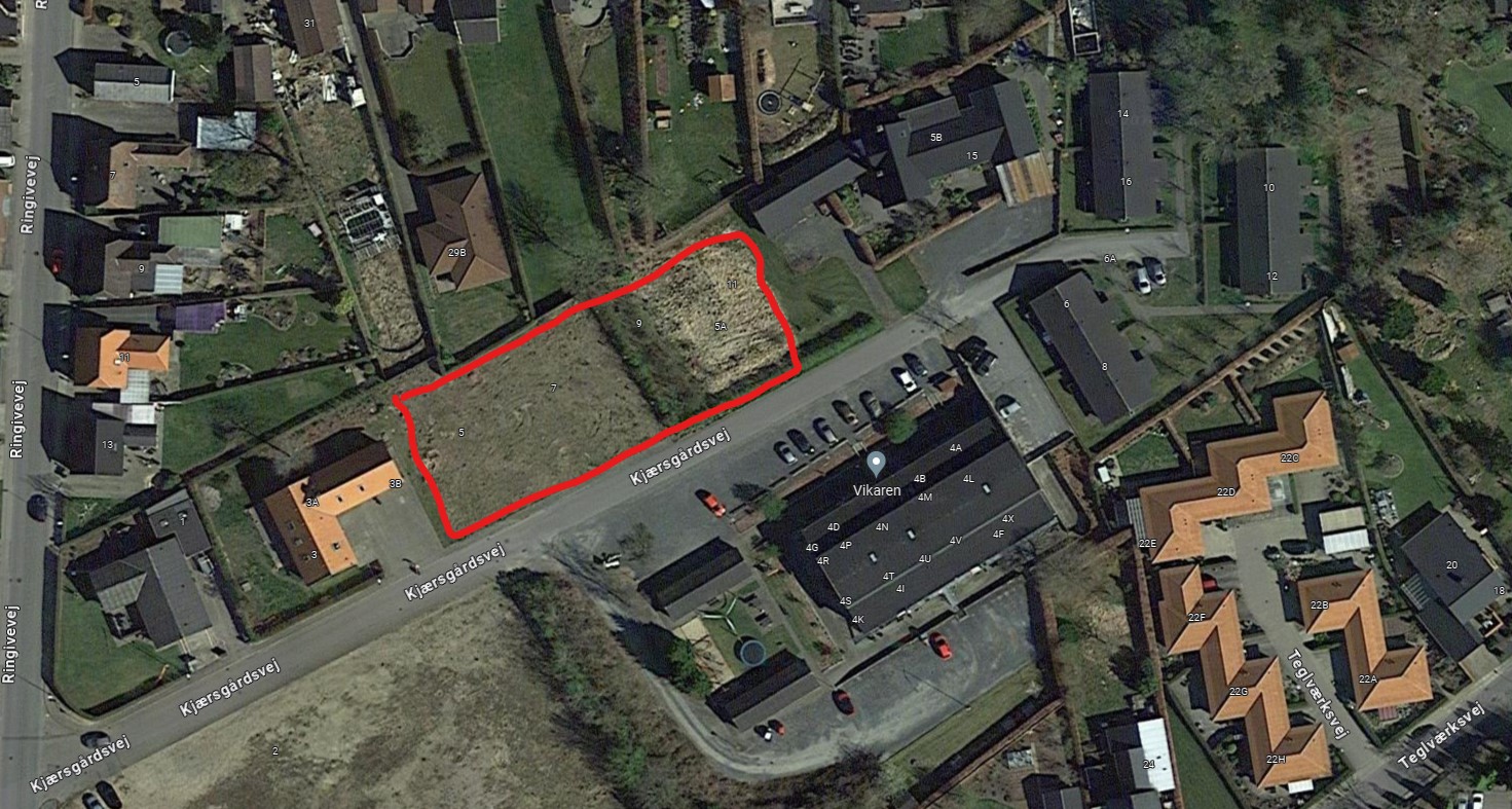 Det er indenfor det røde område på Kjærsgårdsvej, at de fire huse opføres. Foto: Jim Hoff