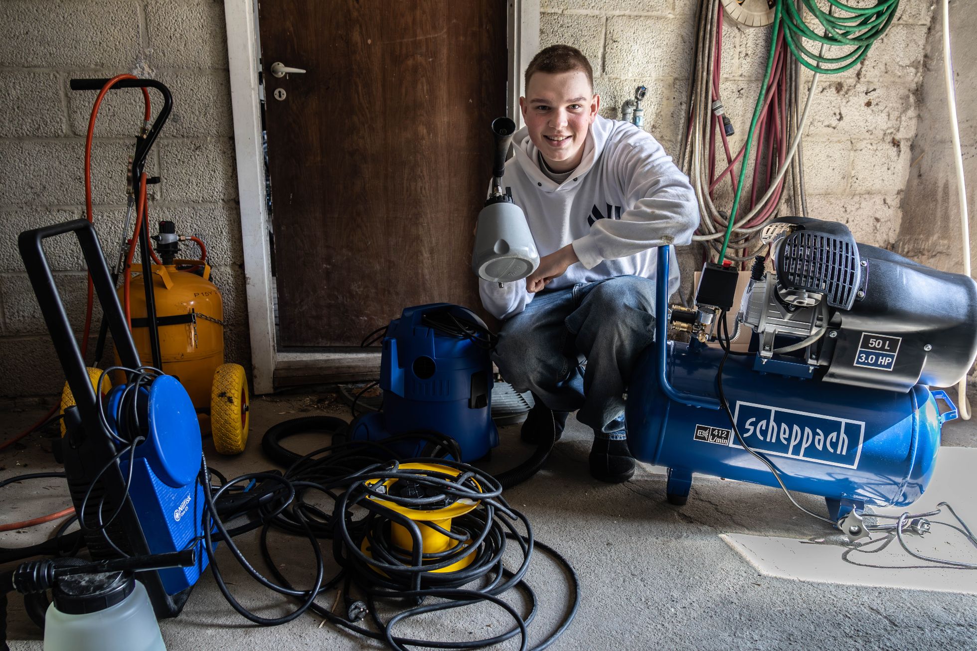 Buster kunne efter blot 3 uger som selvstændig investere 4.000 kroner i nyt udstyr, en tryluftpistol med kompressor, hvilket gør flere rengøringsopgaver noget lettere. Foto: Jim Hoff