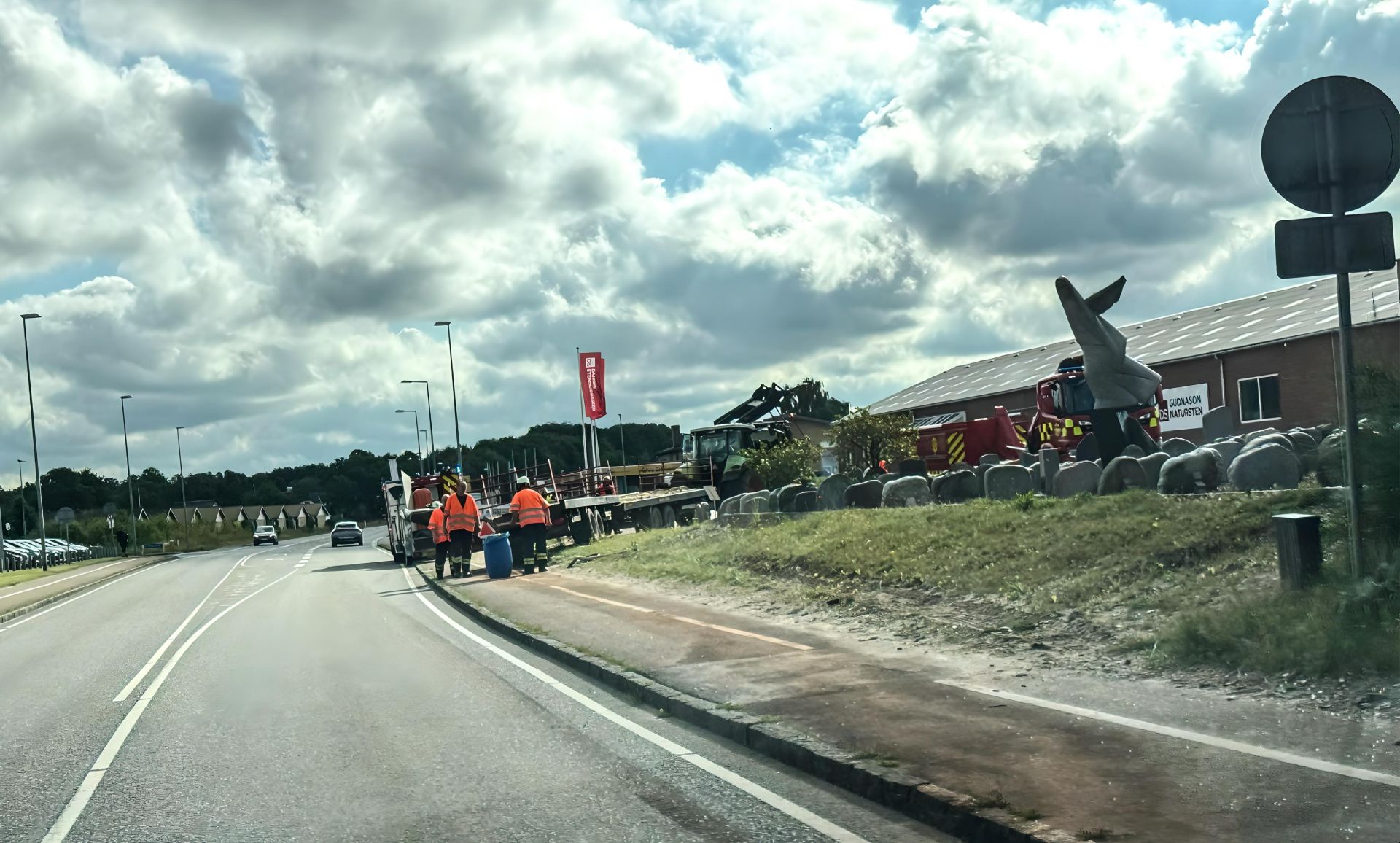 GIVE: Bilister der onsdag eftermiddag passerede under jernbanebroen og forbi vejen ved Boesenbæk og Gudnason på Diagonalvejen i Give blev i et par timer mødt af både blå blink og store fartøjer fra Falck samt en flok travle folk iført orange veste.