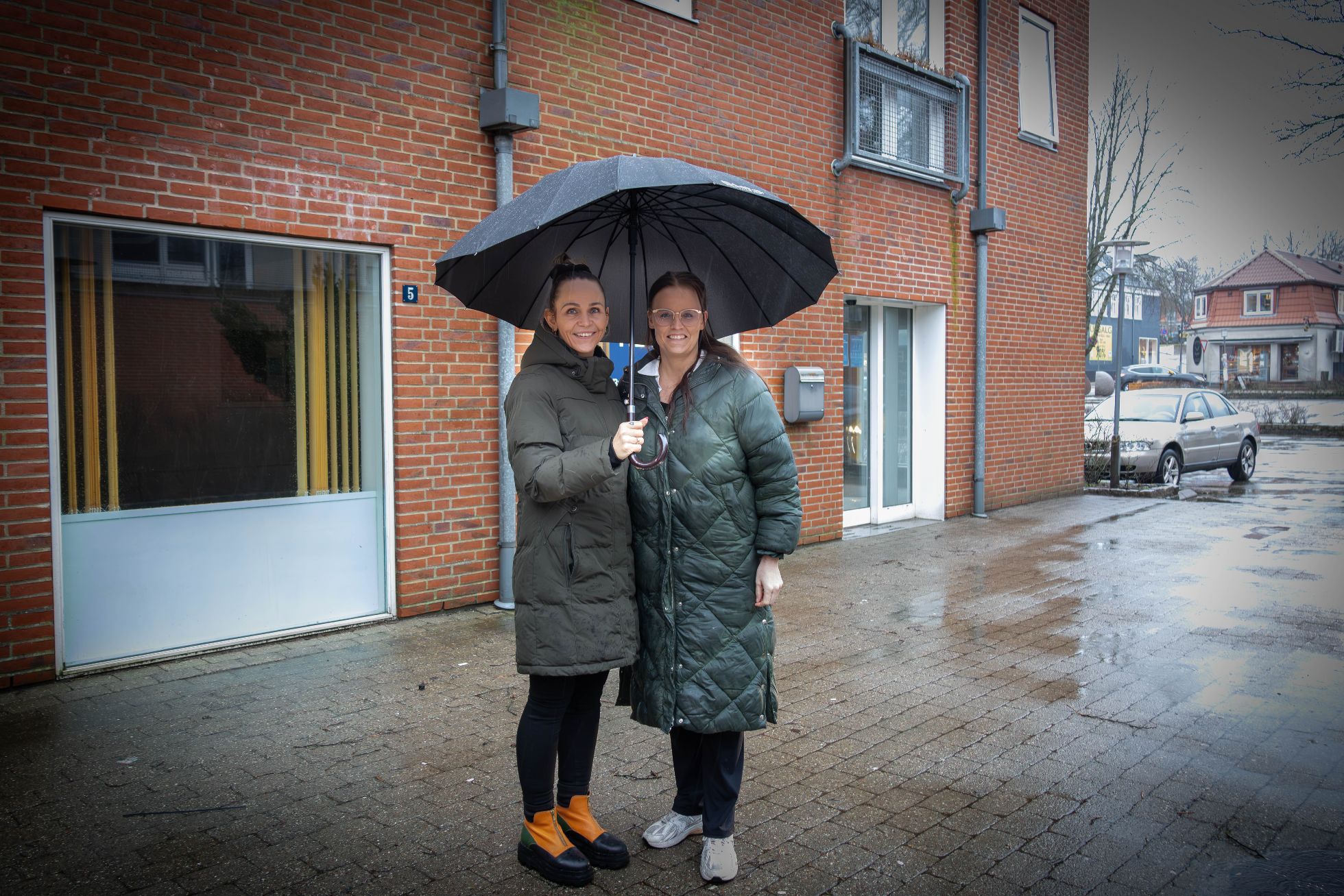 De pointerer begge to, med opslåede paraplyer og brede smil i det herlige regnvejr foran deres snart nye hjemsted, at Flair Klinikfællesskabet er et sted, hvor der er plads til alle.