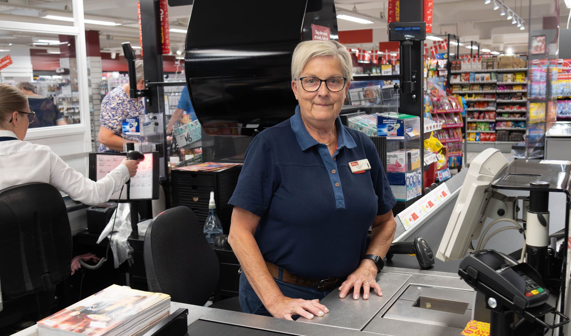 Conny har fast vagt ved kassen tirsdag formiddag, og her bliver det til mangen en god snak med for den lokalkendte kvinde med de mange kunder, der passerer kasseapparatet. Foto: Jim Hoff