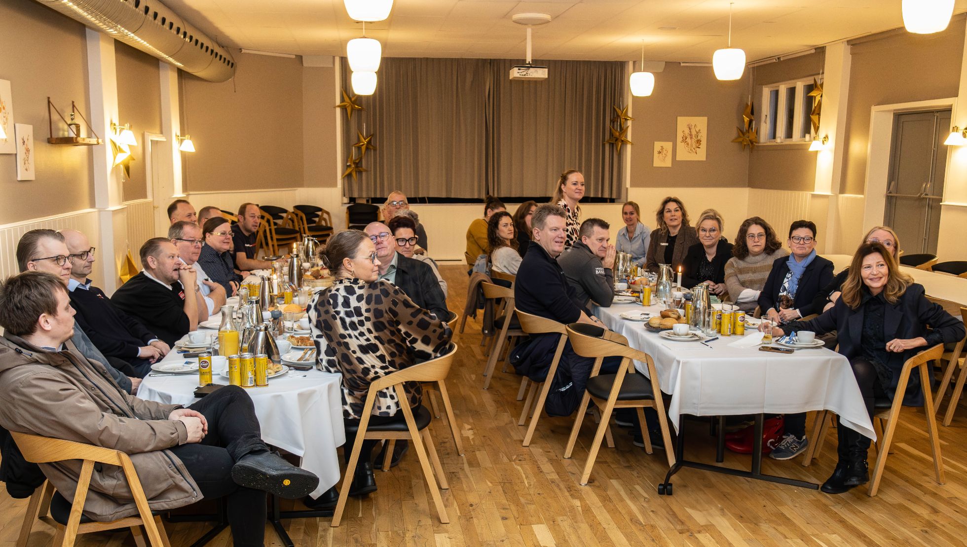 DET GODE BUTIKSLIV: Rigtig mange af medlemmerne fra Give Handel & Erhverv var samlet til morgenkaffe på Diagonalkroen torsdag morgen den 19. december, hvor det udover at dyrke det gode fællesskab på tværs af det alsidige butiksliv i byen, også handlede om af få udtrukket vinderne af dette års juleshopping/gaveregn, hvor handelsstandsforeningen havde sat 50.000 kroner på højkant til gavekort til de mange heldige vindere.