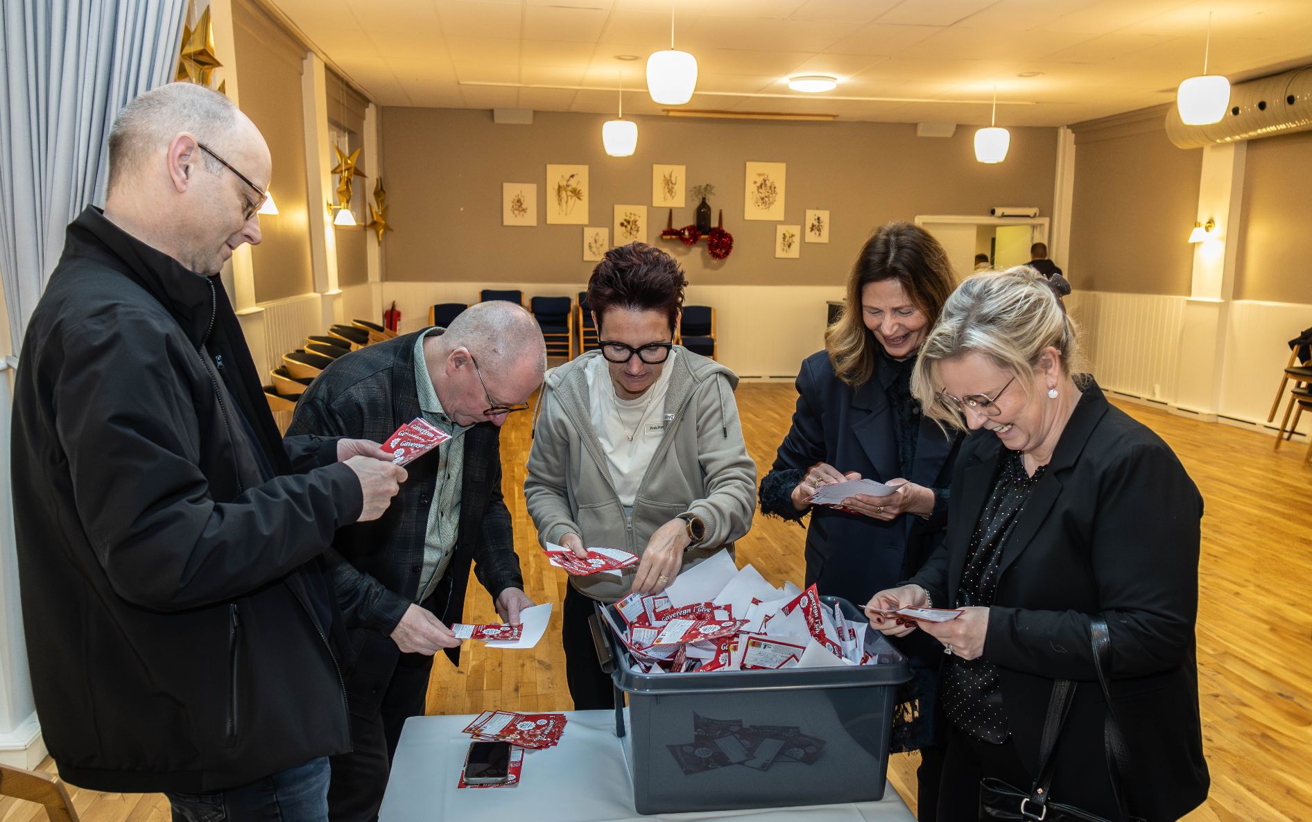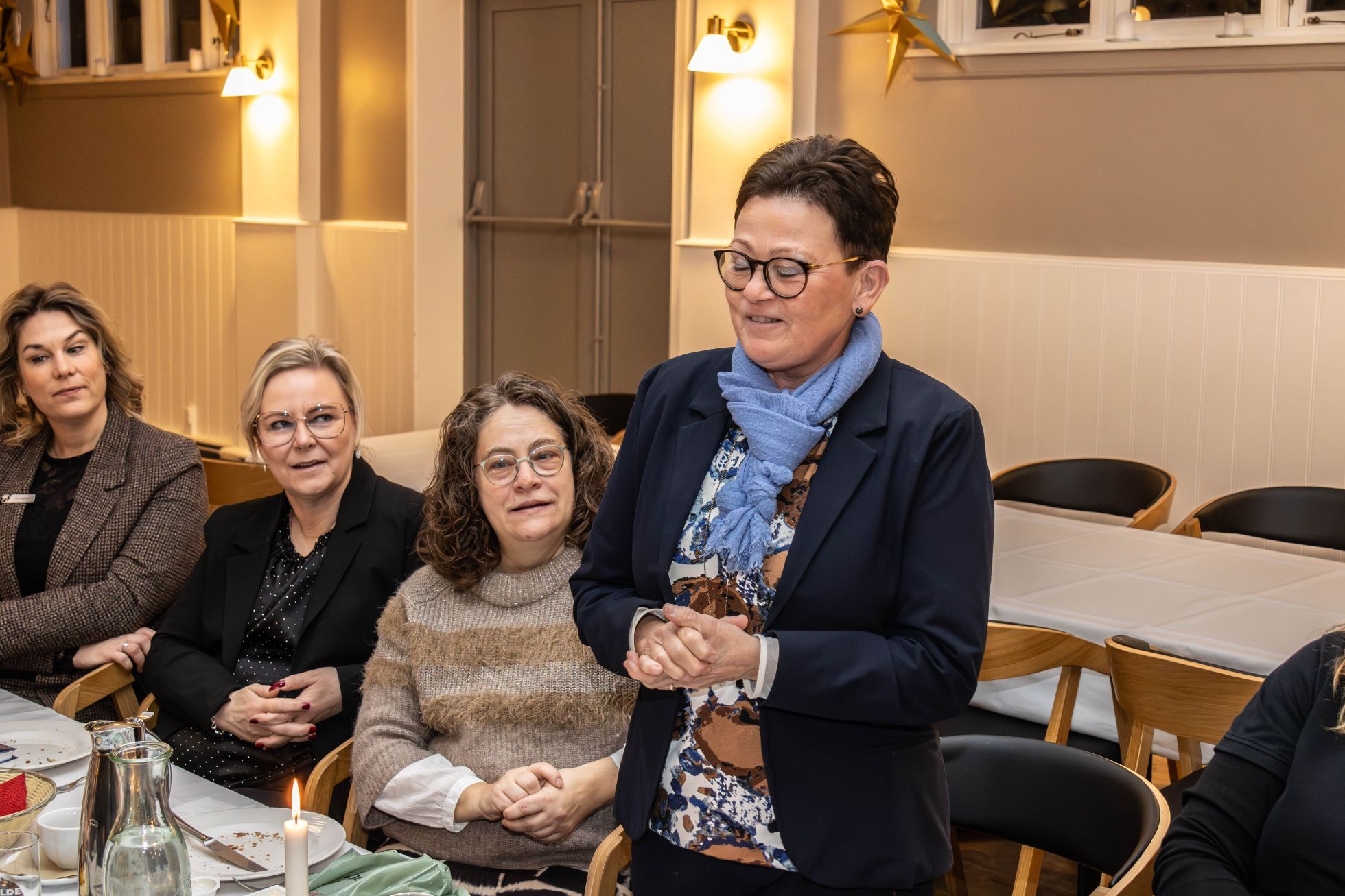 Inden butiksfolket gik over til kassen med de mange indleverede juleshoppingkuponer, blev der også slået på kaffekoppen fra midtersektionen ved bord 1. Her var det Susanne Rye der, med en lille klump i halsen, rejste sig og annoncerede, at hun denne dag havde sidste arbejdsdag hos Boutique Mary.