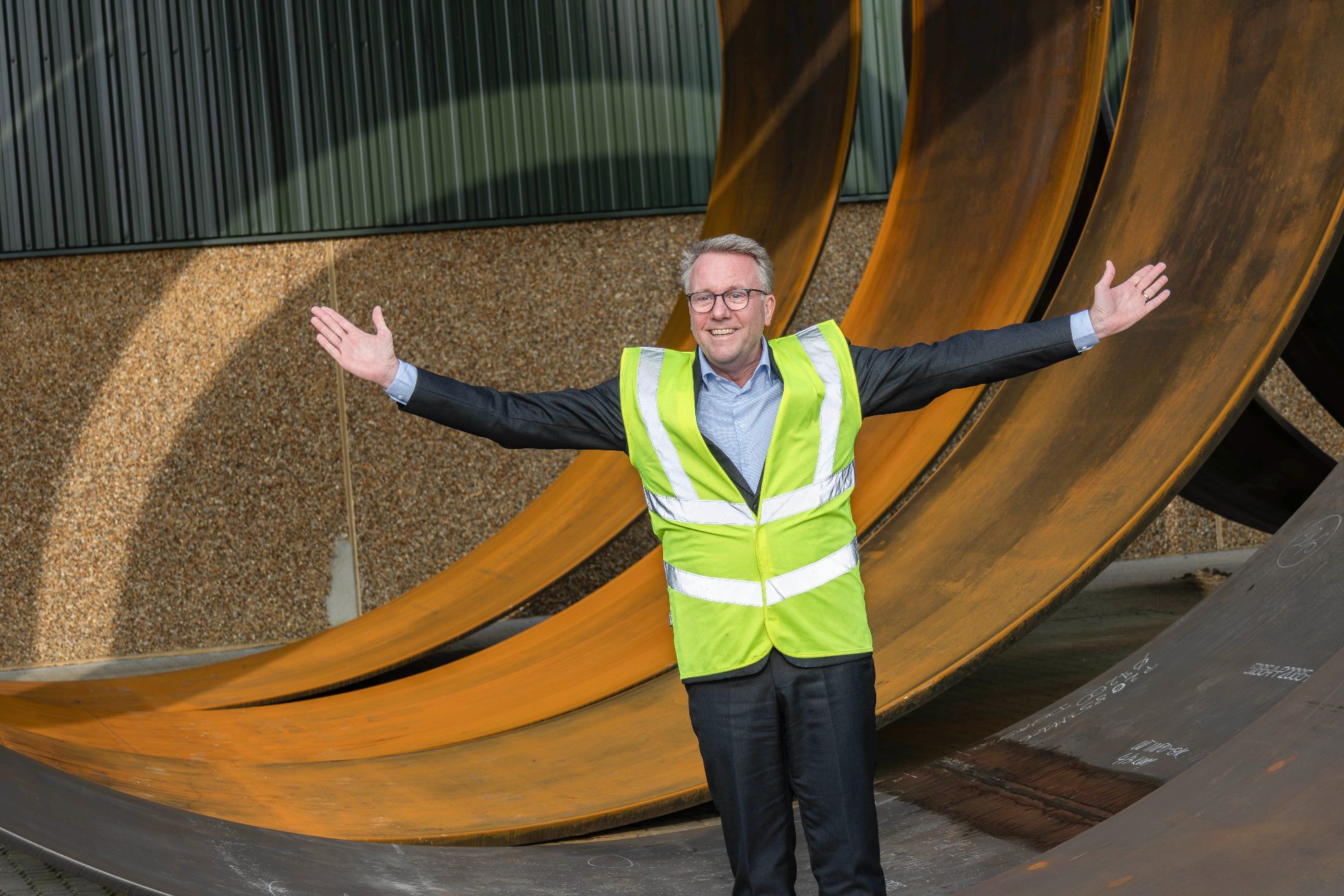 En veloplagt Morten Bødskov var imponeret over de store stålringe, der udgør elementer, der tilsammen bliver til vindmølletårne. Foto: Jim Hoff