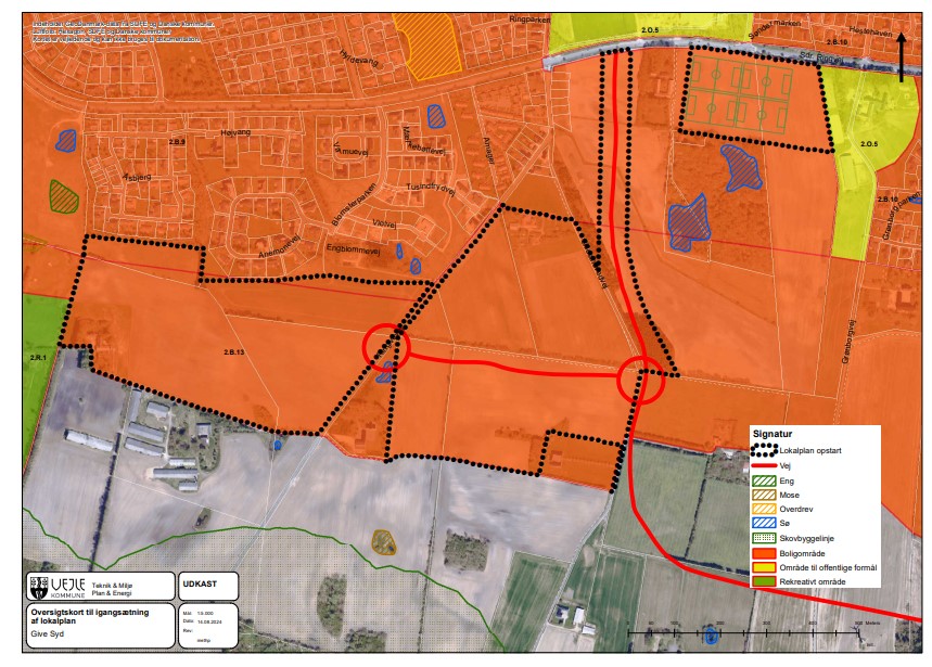Endvidere hedder det i anmodningen fra teknisk udvalg, at udover det ved lokalplaner allerede realiserede område, udlægger Kommuneplanen for Vejle rammer nr. 2.B.9 yderligere et område umiddelbart syd for Sdr. Ringvej og øst for den kommunale udstykning i lokalplan 1216 til boligformål i form af lav boligbebyggelse, offentlige idrætsformål samt fællesanlæg, institutioner og lignende til dækning af lokale behov.
