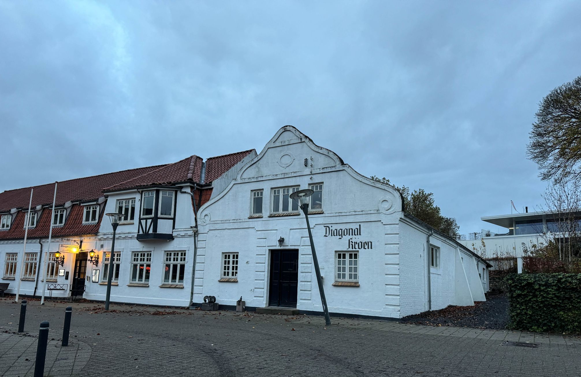 Det Skæve Tårn i Pisa er kommet til Give - og det endda ved et af byens smukkeste vartegn, Diagonalkroen. Foto: Jim Hoff