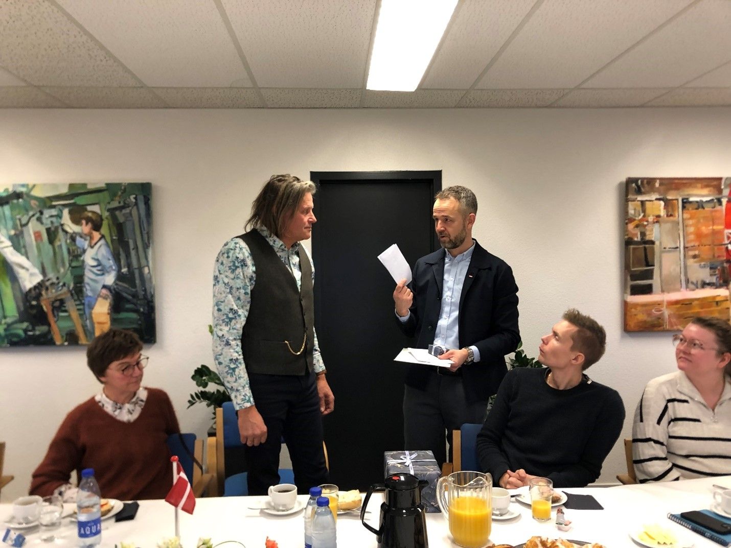 Kristian E. Justesen fra Medarbejderfonden for VKR-Gruppen overrækker her prisen til Pr Hende, Foto: Tove Nybo