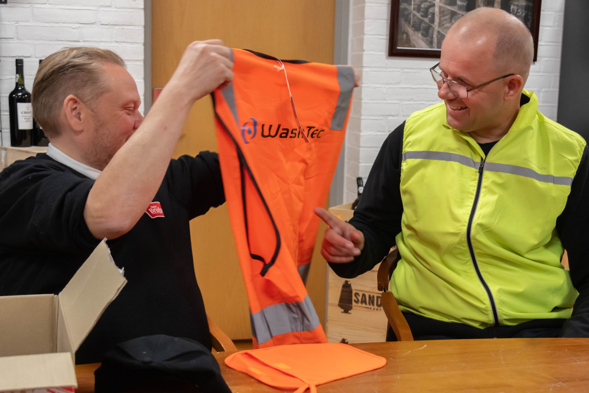 Den fine gavepakke fra Washtec vakte jubel hos Thomas Jepsen, der straks tog den nye orange vest på - og var klar på titlen chefvaskehalssupervisor. Foto: Jim Hoff