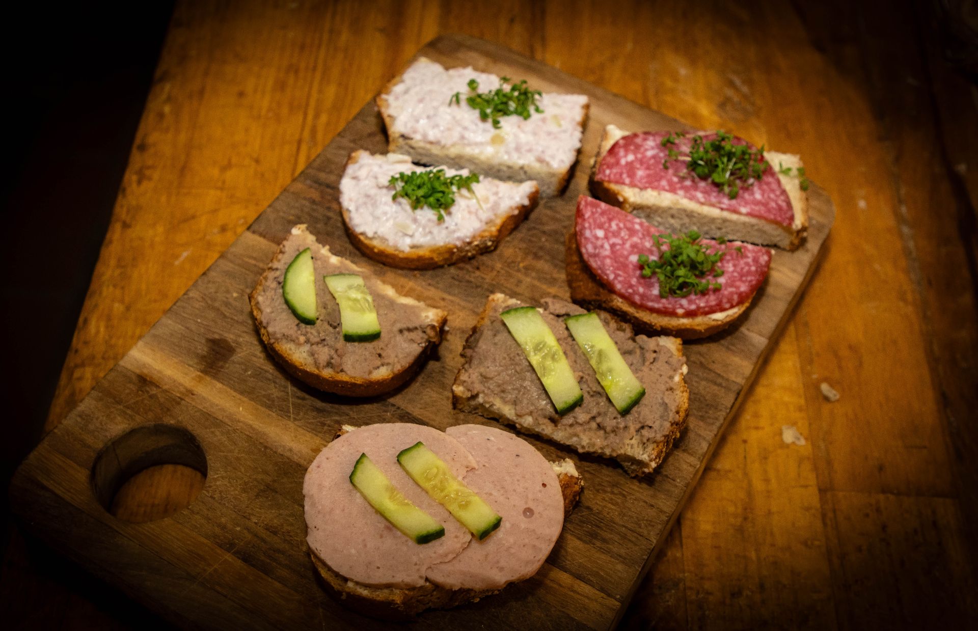 Hun har i dagens anledning med besøg af den lokale verdenspresse smurt et fad med lækkert hjemmebagt (tak Poul Erik) surdejsfranskbrød med pålæg fra Slagter Kirkeby. Her er der smagsprøver på skinkesalat, spegepølse, leverpostej og en børnepølse - og det kan kun anbefales her fra den altid sultne redaktør.