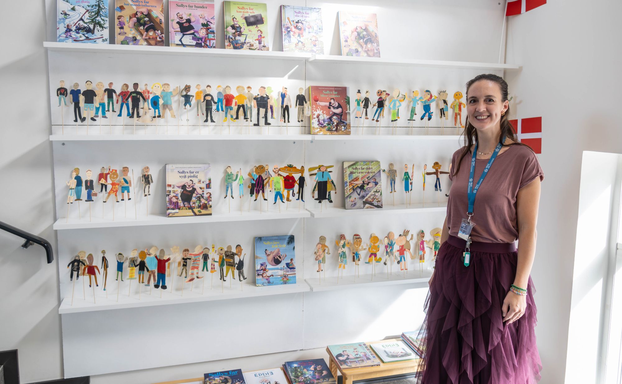 Foto 2: Her viser børnebibliotekar Stine Bo de mange flotte og sjove papfigurer frem, som børnene i 2. og 3. klasse på Firkløverskolen havde fremstillet til dagens workshop med forfatter Thomas Brunstrøm. Foto: Jim Hoff