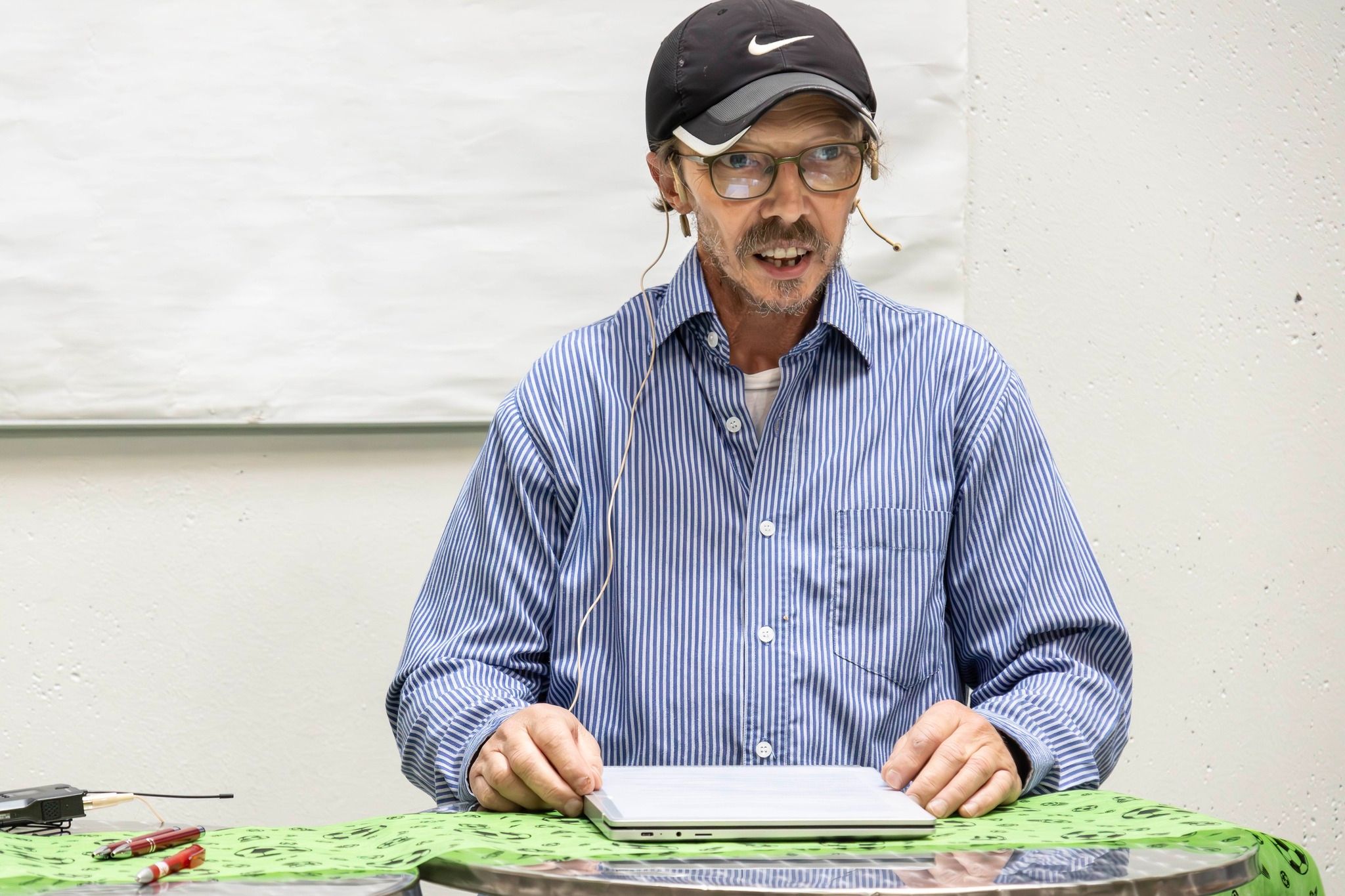Givskud Hallens bestyrelsesformand Nicolaj E. Sørensen leverede en rigtig fin tale om historien bag den nu 40 år gamle idrætshal. Foto: Jim Hoff