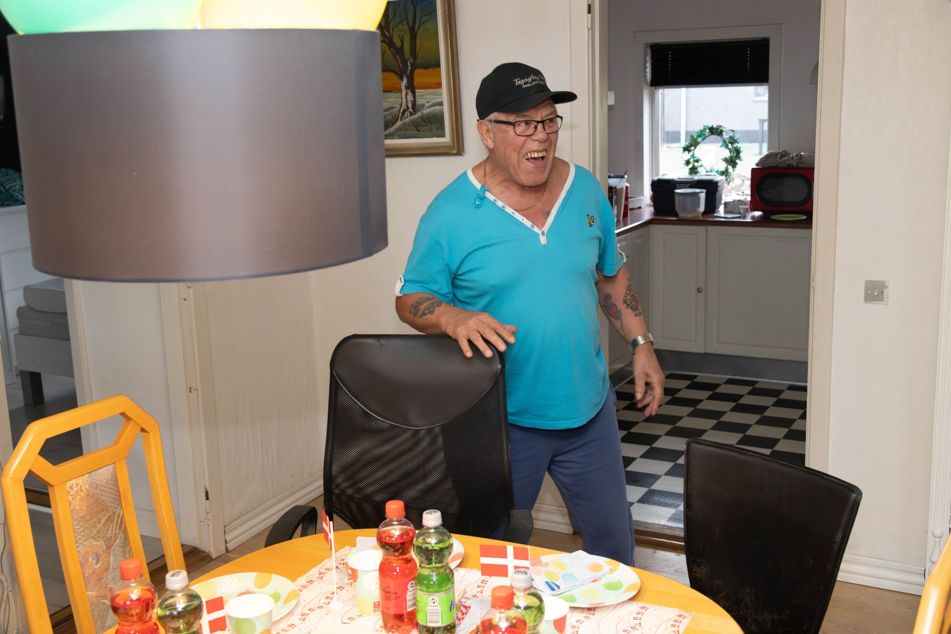 Det var en både glad og overrasket Peter Andersen, der kom ind i den fødselsdagsstemte stue, da han kom hjem fra et iscenesat nabobesøg. Foto: Jim Hoff