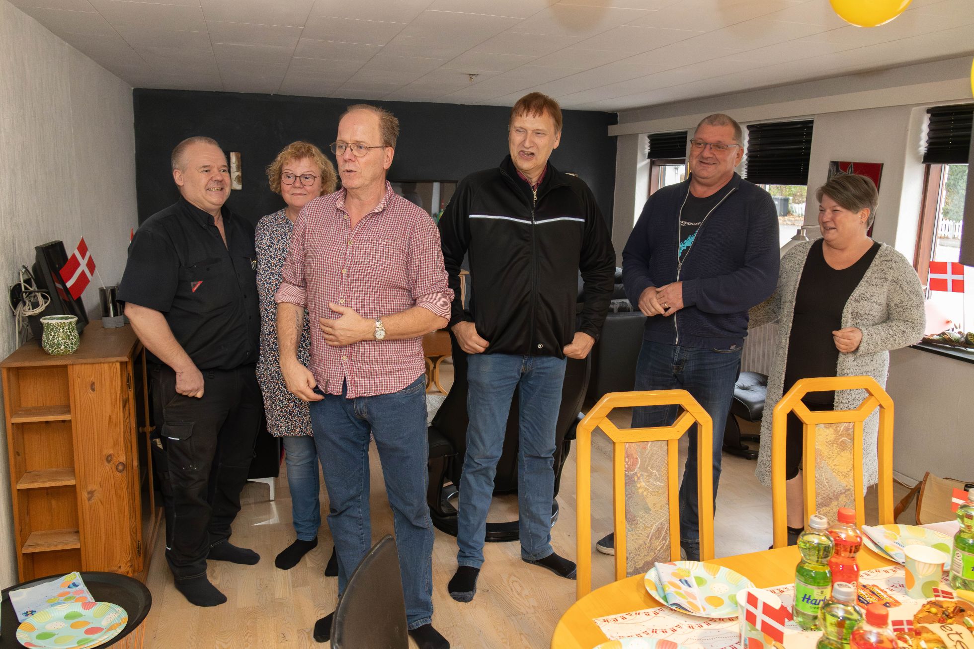 Det var denne flok herlige mennesker, der overraskede Peter Ulv med en flot fejring af hans "1-års fødselsdag". Fra venstre er det Frank, Sussi, René, Niels Kristian (en af redningsmændene), Jan Falck og Annett. Foto: Jim Hoff