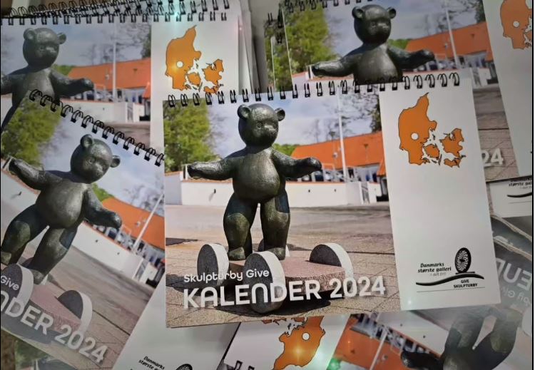 Skulpturby Give lancerede foreningens nye kalender til Isskulpturfestivalen, hvor de solgte dem og skulpturvinen. Nu kan du så også købe kalenderne hos Give Bog og Leg og i Brugsen.