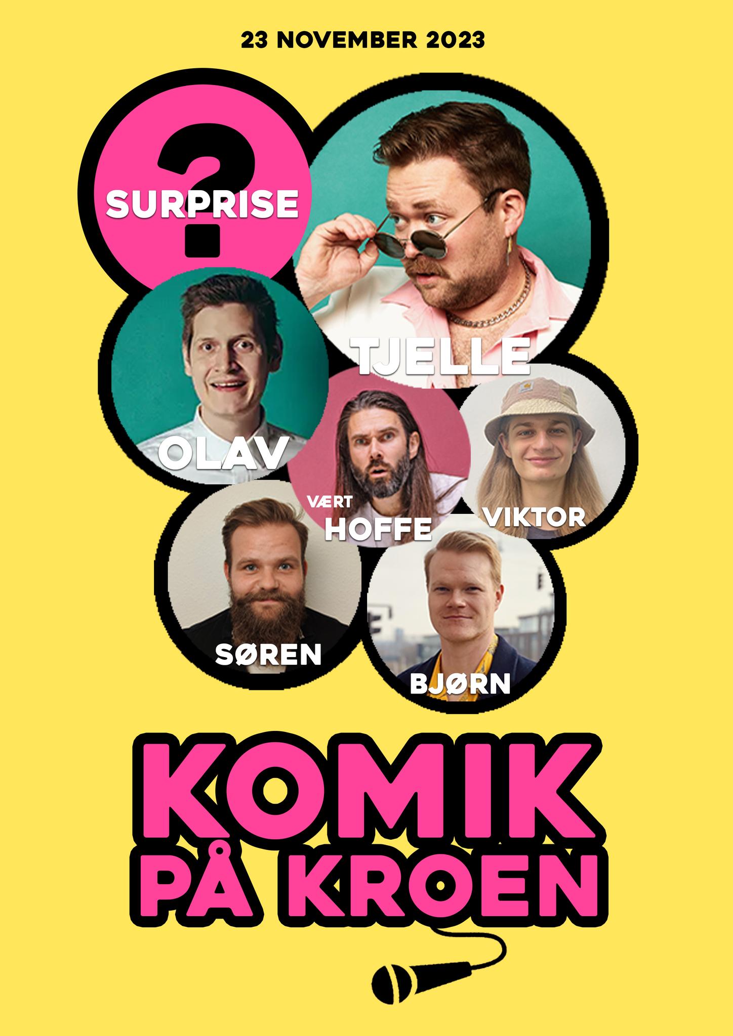 Her et overblik over de optrædende den 23. november til Komik på Kroen. Grafik: Daniel Hoff