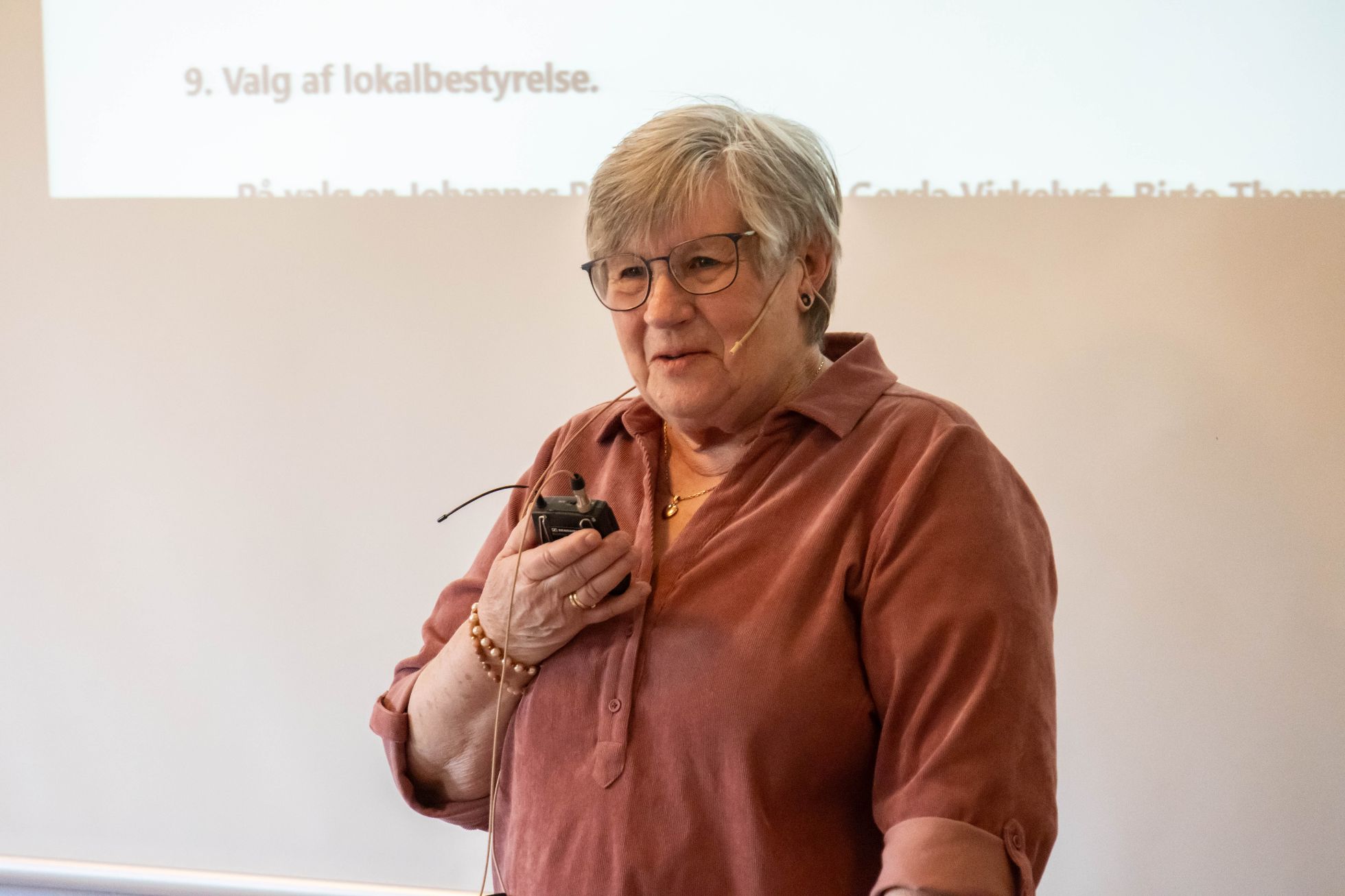 Ældresagens formand, Ester Mikkelsen, fremlagde sin årsberetning og kunne berette om en aktiv forening - og at man fremover vil holde til i Sognehuset i Give med mødeaktiviteter. Foto: Jim Hoff