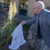 Foto 2: Kaj kunne som det første efter den officielle indvielsestale løfte tæppet af denne smukke sten, som Kastaniehaven har sat i den fine sansehave. Foto: Jim Hoff