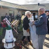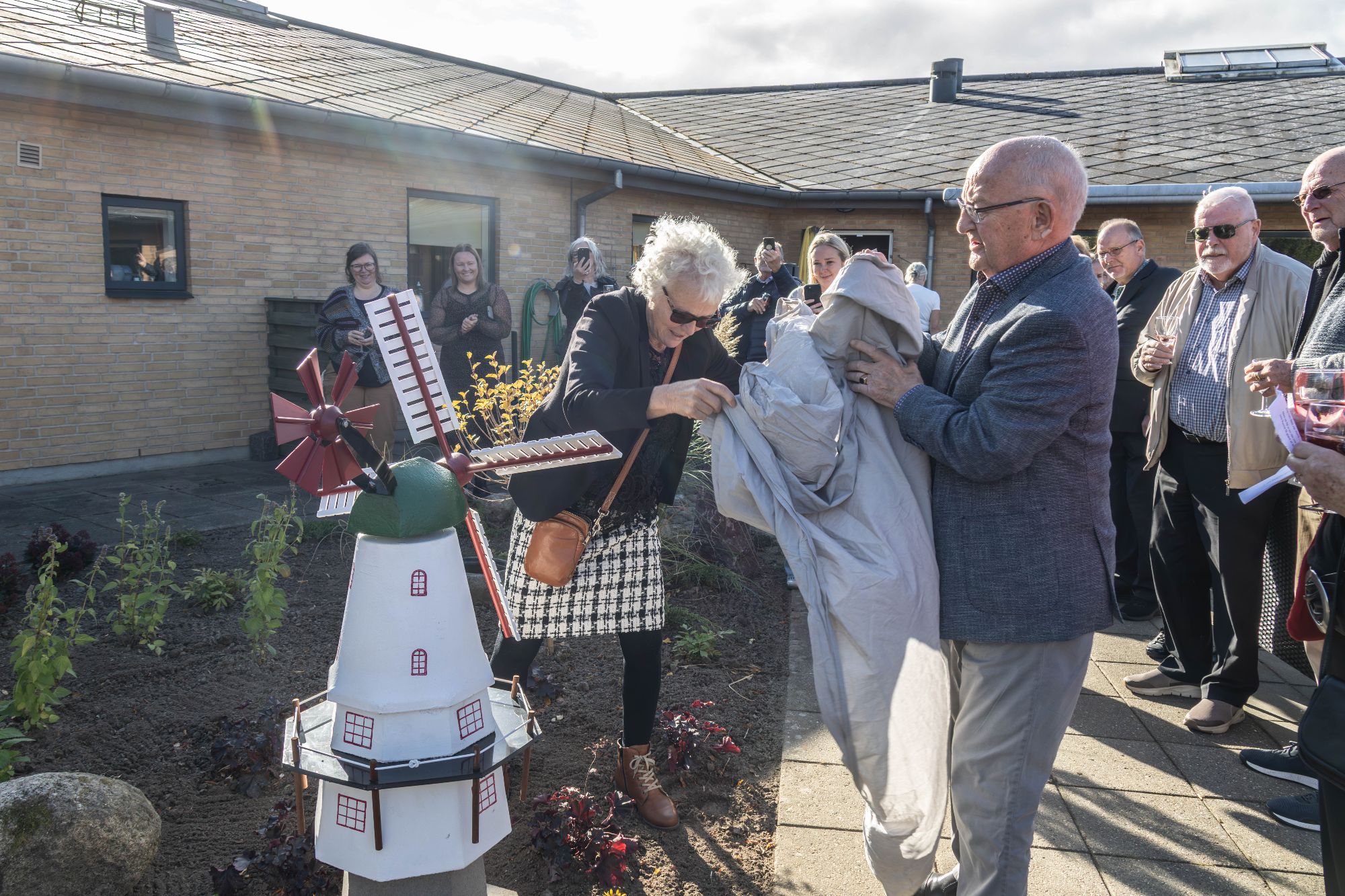 Derefter kunne Kaj så tage tæppet af én af to ’hemmeligheder’, der skulle afsløres på dagen. Det var en flot sten med påskriften ’Sansehaven er skænket af tidligere Toyota-forhandler Kaj Schnorr’, og hemmelighed nr. 2, som Kaj også fik æren af at trække det store lagen af, var en flot vindmølle i træ skænket af Husrådet i Hus 12 som en anerkendende gestus til Kajs donation – og endnu et fint element til elementer, der kan pirre sanserne.