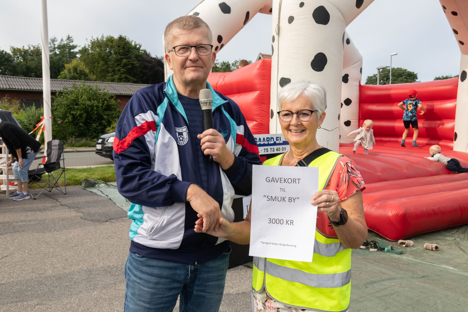 Det var dog ikke samtlige 11 medlemmer, der var til stede på dagen men foreningens formand, Tova Andersen, var på plads, da hun midt formiddag under festlighederne på markedspladsen ved Thyregodcentret blev kaldt op af Thyregod-Vester Borgerforenings formand, Jens Erik Svane, der havde både flotte ord og en fin gave, han ville overrække til Tove.