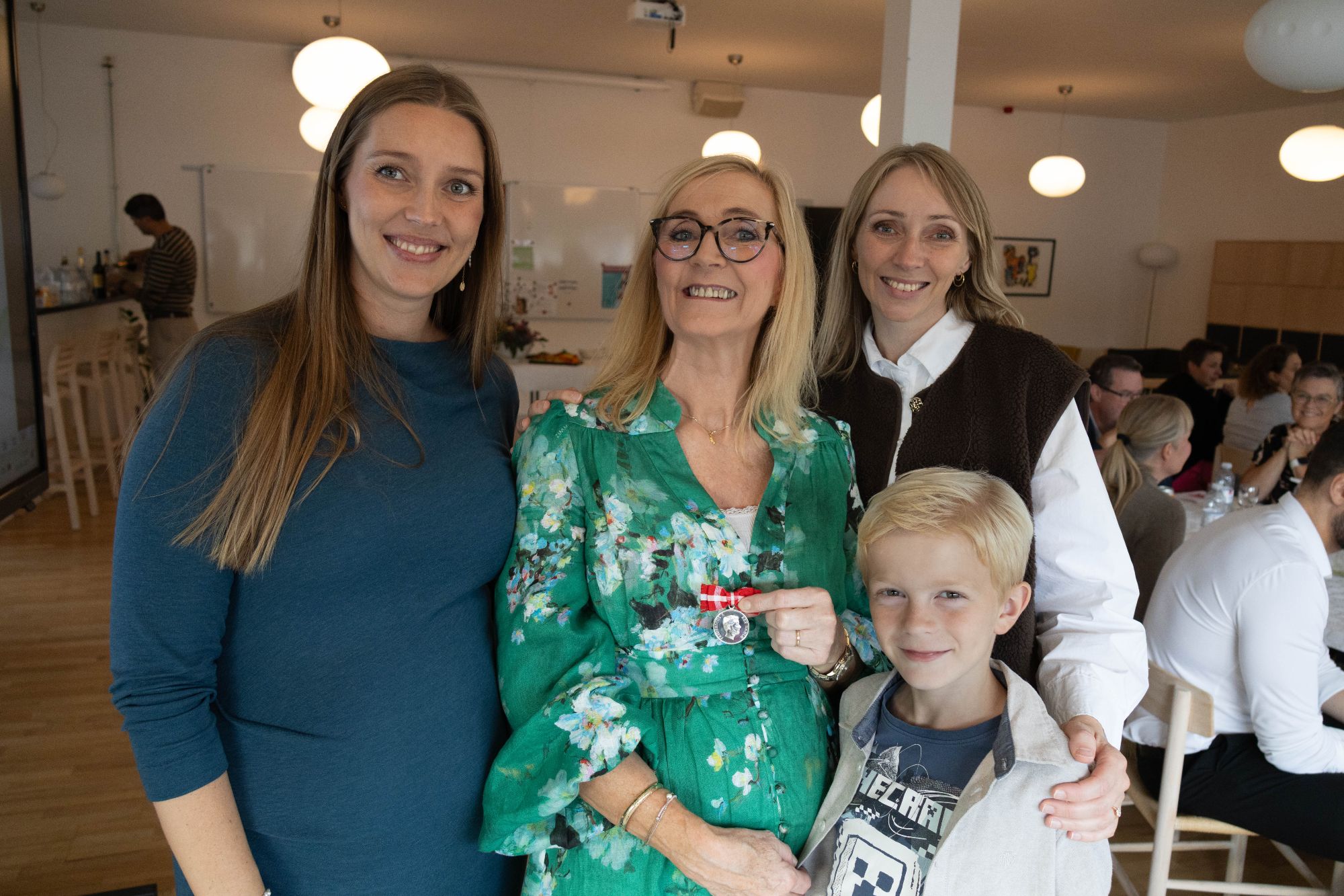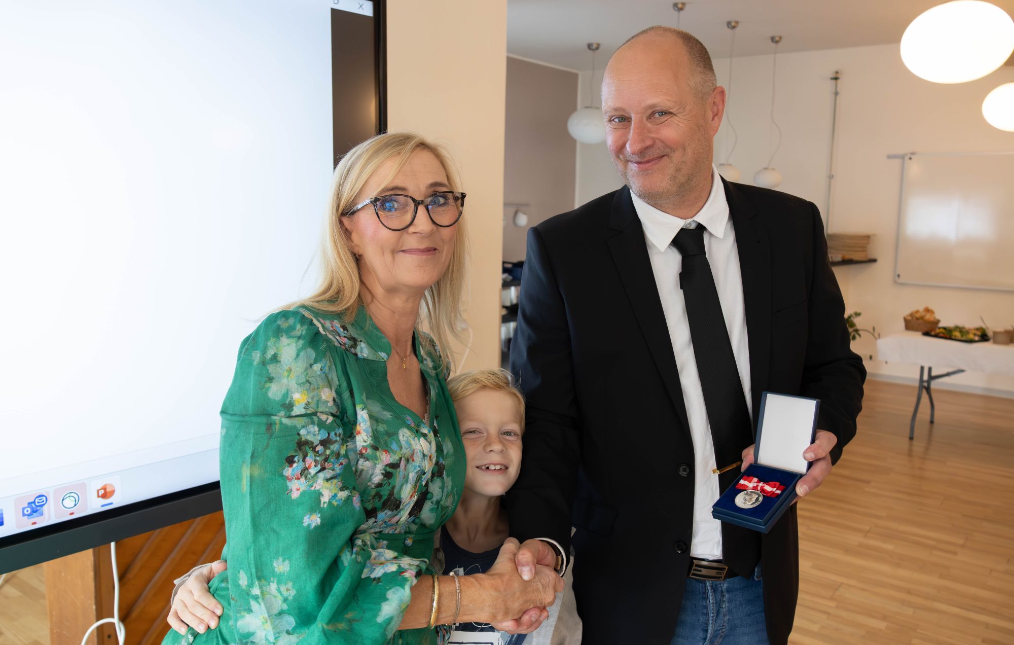 Og så var det tid til overrækkelse af den omtalte Kongelige Fortjenstmedalje samt et brev fra De Kongelige Danske Ridderordeners Kapitel. Eller som Pia med røde kinder og glade øjne med barnebarnet Samuel ved sin side impulsivt formulerede det ved overrækkelsen: