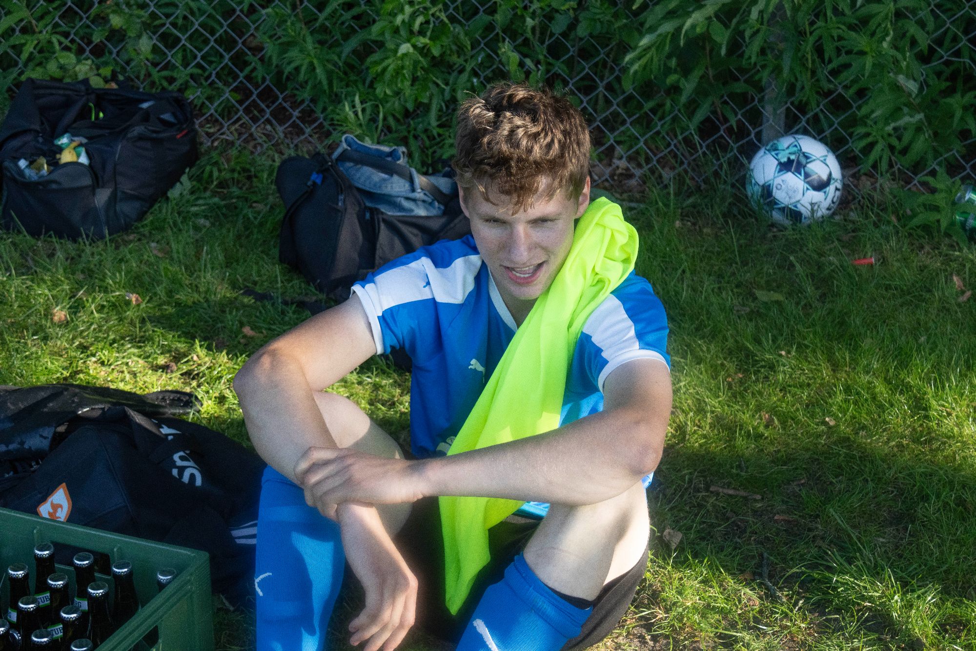 Det er hårdt at spille to mand i undertal, og så må ungdommen jo løbe en masse ekstra sure meter - denne unge gut fik da også en velfortjent pause efter et kolossalt løbearbejde - og væskebeholdningen er jo lige i nærheden., smiley. Foto: Jim Hoff
