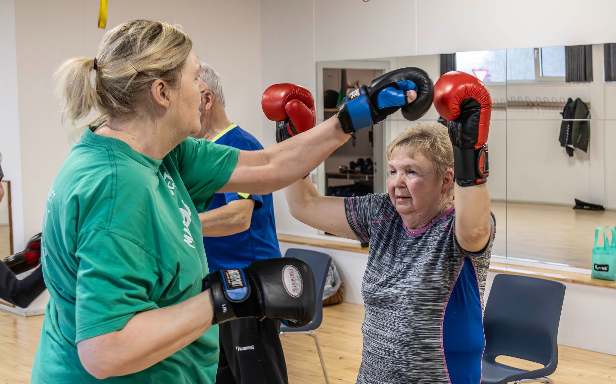 Parkinsonboksning, som Alice går til i Give Atletklub flere gange om ugen, var naturligvis også på programmet. Foto: Jim Hoff