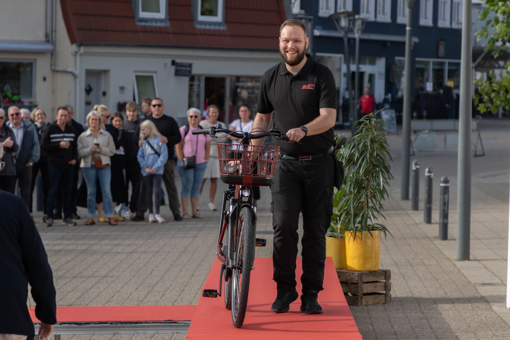 I efteråret 2024 var der udendørs modeshow på Torvet i Give med et alsidigt udvalg af udbydere. Her er det SØ Cykler, der viser en flot model (cyklen, altså) frem. Foto: Jim Hoff