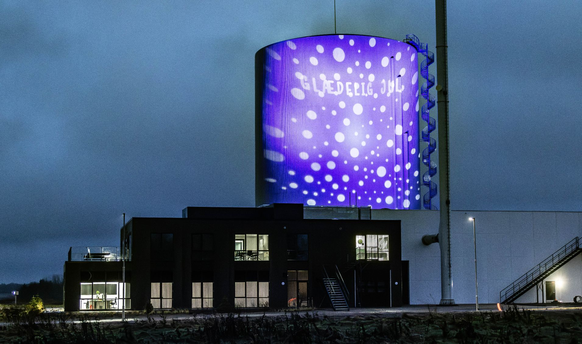 Når du kører ind i på torvegade i Give via Tykhøjetvej efter 16.30 vil du blive mødt af et ganske imponerende syn. Den 40 meter høje varmeakkumuleringstank ved Give Fjernvarme på Østerhovedvej oplyser nemlig nattehimlen i røde og blå nuancer med ønsket om en glædelig jul. Den unge mand bag dette lysende mesterværk værk er 18-årige Kristoffer Wojcik fra Give.