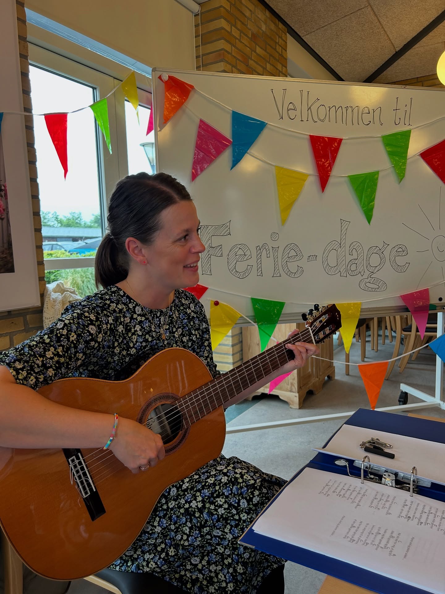 Musikterapeut Sara Schou Nielsen sørgede onsdag formiddag for en masse god musk og fællessang. Privatfoto