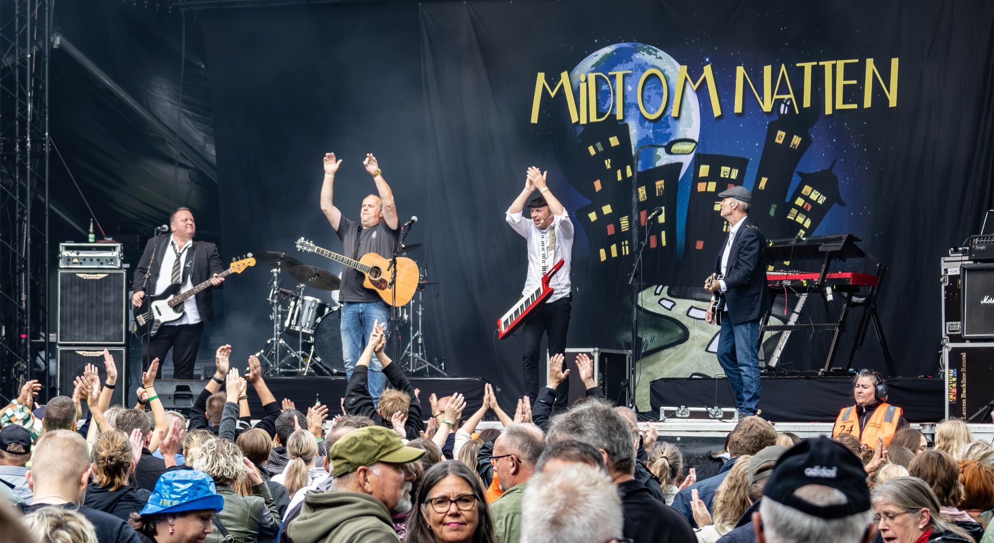 -Overordnet set havde vi en igen en rigtig god og stemningsfuld fest. I år slap vi også for trælse episoder, og selv om vi med de her godt 1900 solgte billetter havde omkring 100 færre solgte billetter end i 2023, så var folk klar og med til at skabe en god fest. Naturligvis var vi bekymrede i forhold til en noget dyster vejrudsigt, og det regnede jo også tæt helt op til Kandis gik på scenen klokken 13.00. Men så klingede det af, og da Midt Om Natten gik på klokken 15.00, var det med en tætpakket festplads – og i tørvejr lyder det fra Anders og Lars.