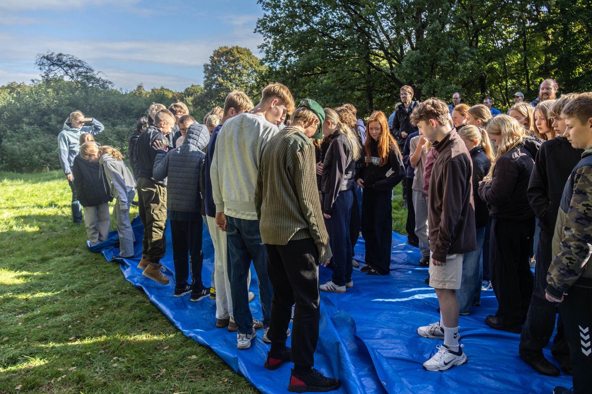 Samtlige 85 deltagere blev placeret på en stor blå presenning, og så lød ordren fra Morten: Vend presenningen – uden at nogen forlader den!