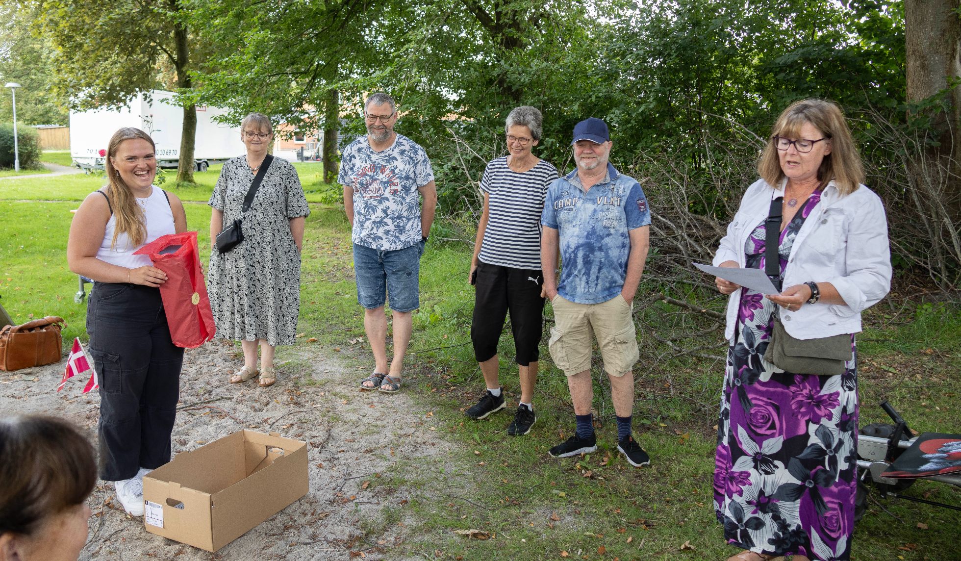 VONGE: Vi skriver torsdag formiddag ved 10-tiden. Ude i de grønne omgivelser ved Øster Nykirke Skole i Vonge går pædagogmedhjælper Karin Laursen og hygger sig med en flok børn, der har gang i forskellige aktiviteter ude ved Krudthuset. Pludselig dukker en 6 mand/kvinde høj flok ud af buskadset som glade trolde af en æske og råber “Hurra, og tillykke med jubilæet Karin”.