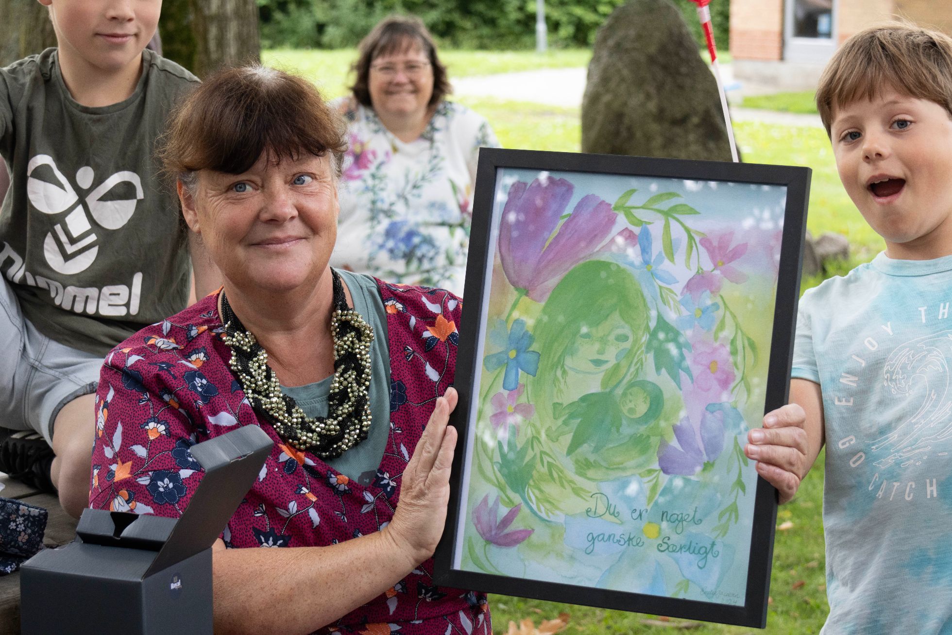 Der var 9 gaver til Karin i forbindelse med Jette Blåbjergs tale, og den ene af dem var meget personlig: Et billede med påskriften: Du er noget helt særligt! Foto: Jim Hoff