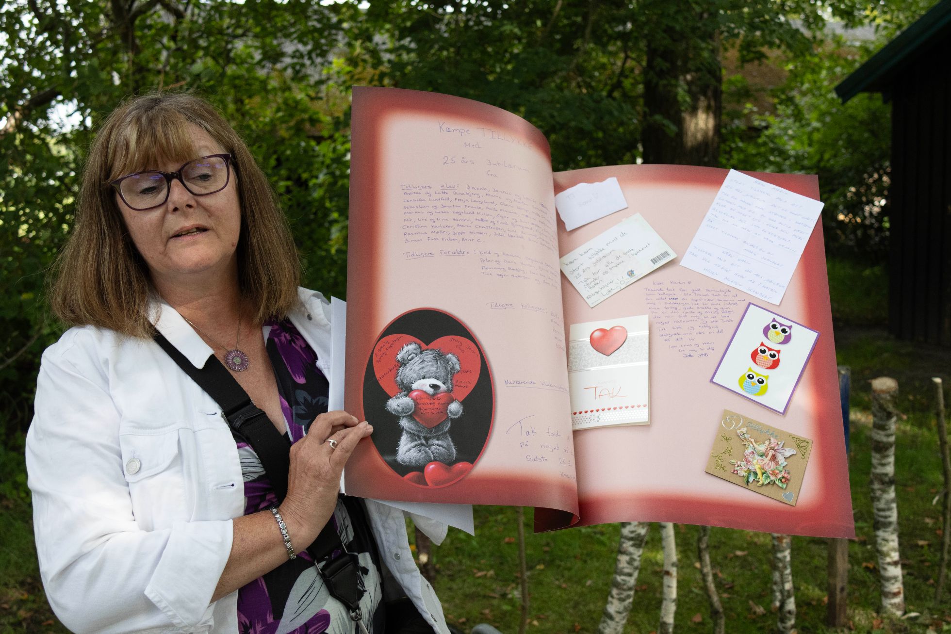 En af gaverne til Karin var en stor bog med samling af kærlige udsagn og tegninger fra børn og kolleger. Mon ikke den får en fast plads på natbordet. Foto: Jim Hoff