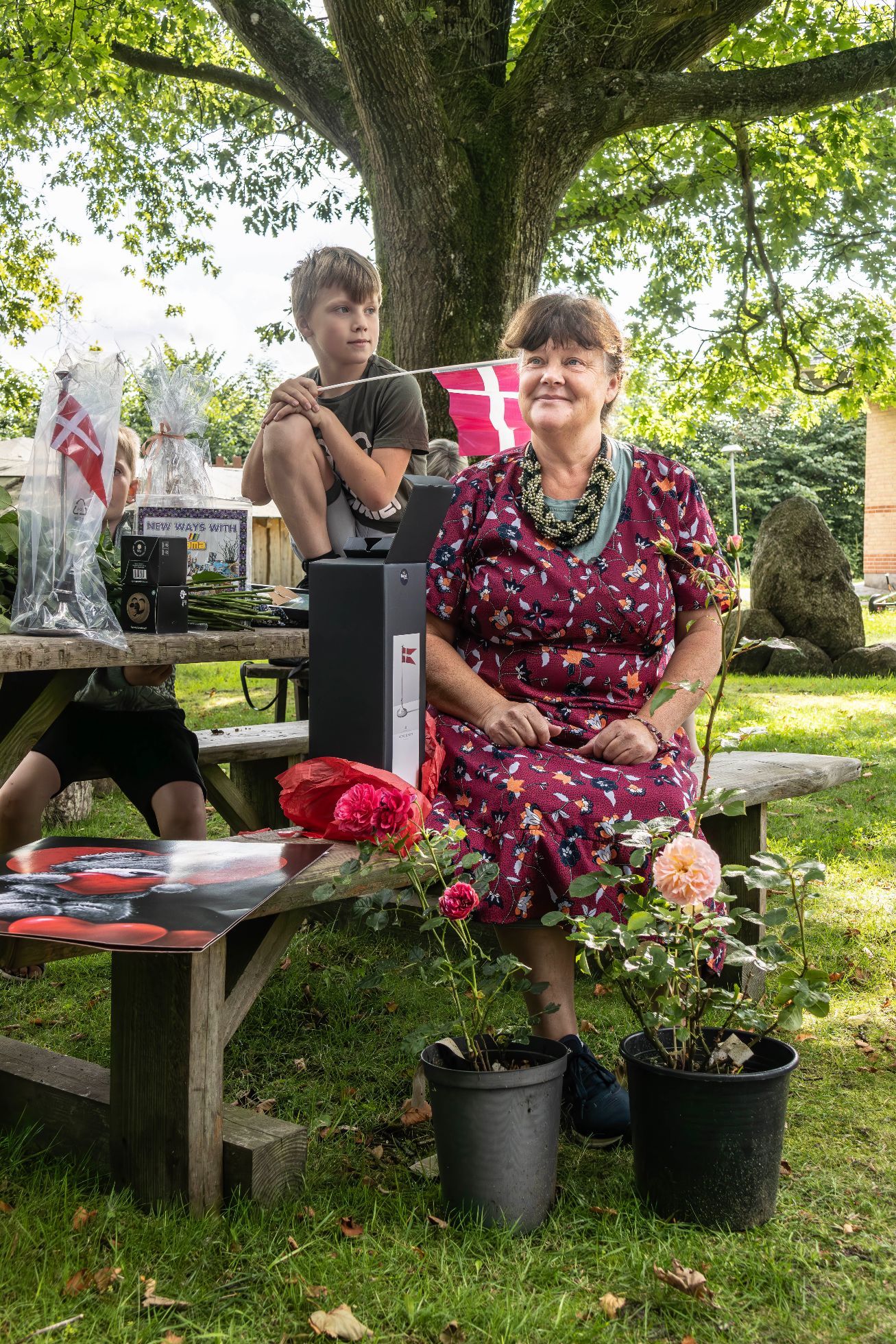 Iført det fine festskrud, bænket ved træbordet med flagjublende kolleger og børn omkring sig modtager Karin så en flot tale fra Jette. En tale der ikke kun leverer fine ord men også hele 9 gaver, der alle knytter sig til Karins kompetencer, personlighed og store pædagogiske kvalitet.