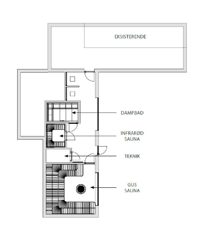 Her har vi et overblik over fordelingen af rum i de 96 m2 store saunhus. Grafik: Center Thyregod
