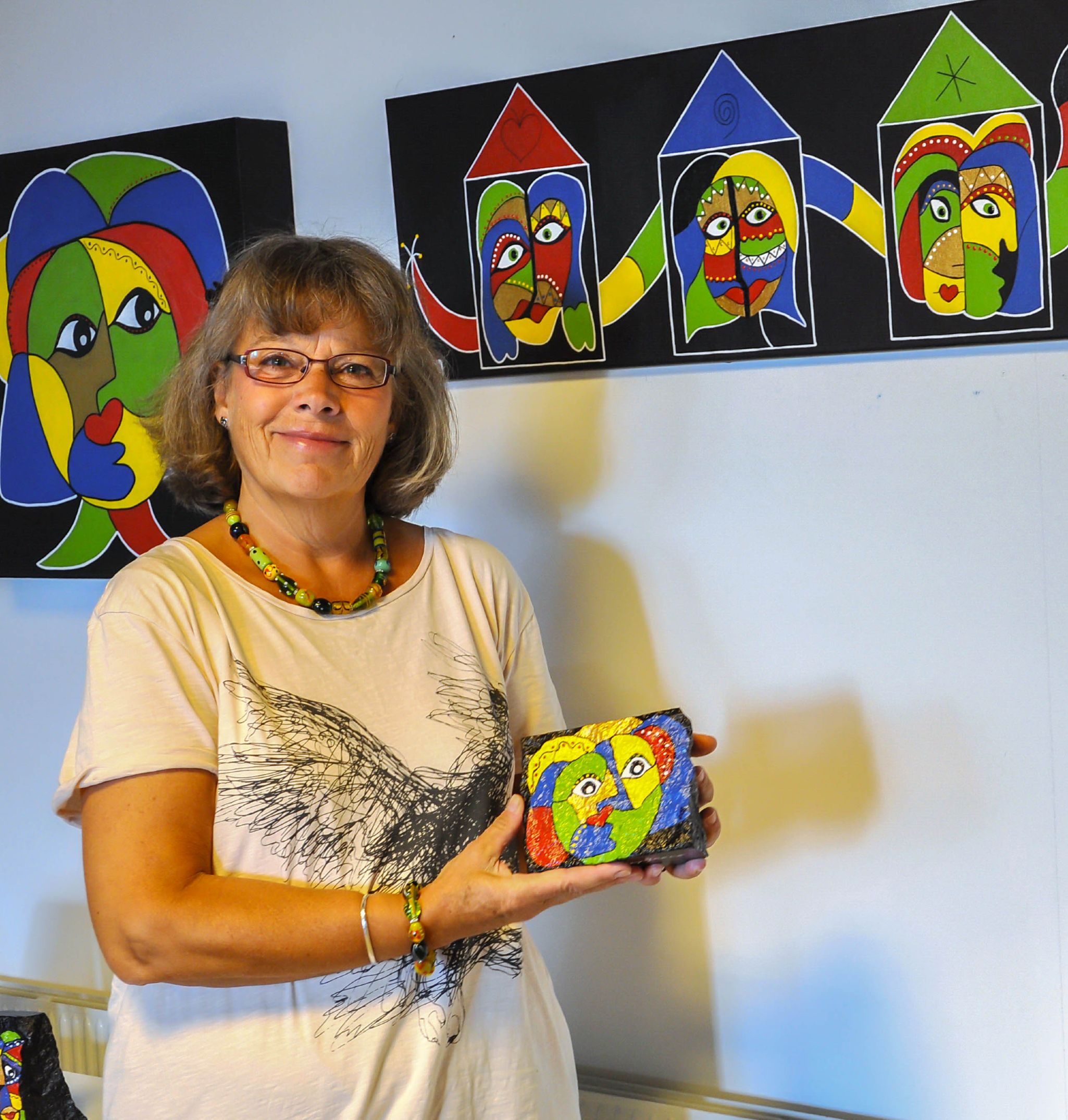 Britta er kendt for sin livsglade og farverige malerier, og hun har også lavet små stenskulpturer med de herlige glade motover. Foto: Pia Obenhausen Hoff