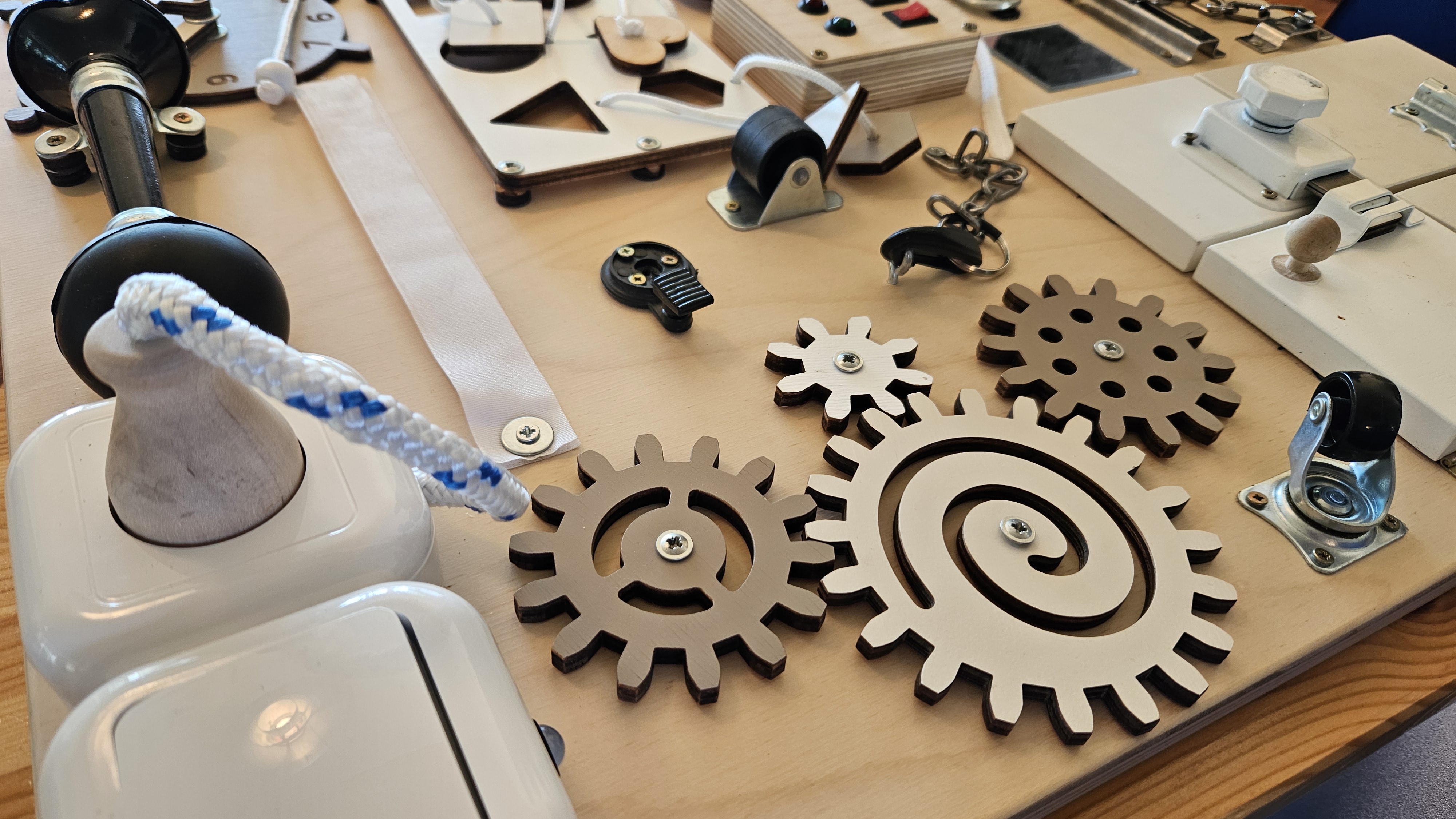 Foto: Juni måneds reparation på Repair Cafe på Museum Give var denne aktivitetstavle, der via dygtige hænder kom op at køre igen. Derudover blev der også lavet en søjleboremaskine, to symaskiner, en vandslange, en højtryksrenser, to par joggingbukser og en fleecetrøje. Foto: Museum Give