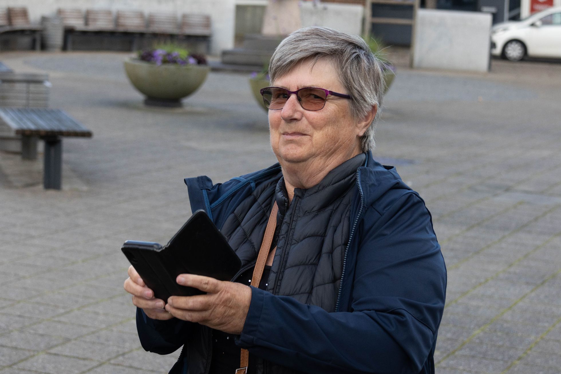 Aase Grønbæk, der er formand i Hoven Energi- og udviklingsfond havde taget turen til Give for at være med til at sende de tre chauffører til Ukraine med de tre minibusser. Fonden har doneret flotte 45.000 kroner til det gode formål. Foto: Jim Hoff