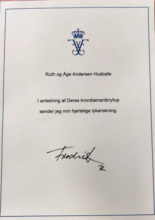 Udover glæden ved at se de mange gæster, var det også et højdepunkt for Ruth og Åge, da der landede et lykønskningsbrev på bordet foran dem fra selveste kong Frederik i dagens fornemme anledning.