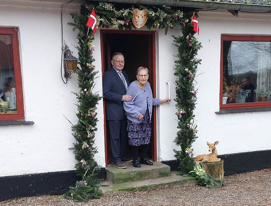 Ruth og Aage stod klar i døren unden den fine æresport, da 90 gæster sang morgensang i dagne fine anledning. Privatfoto