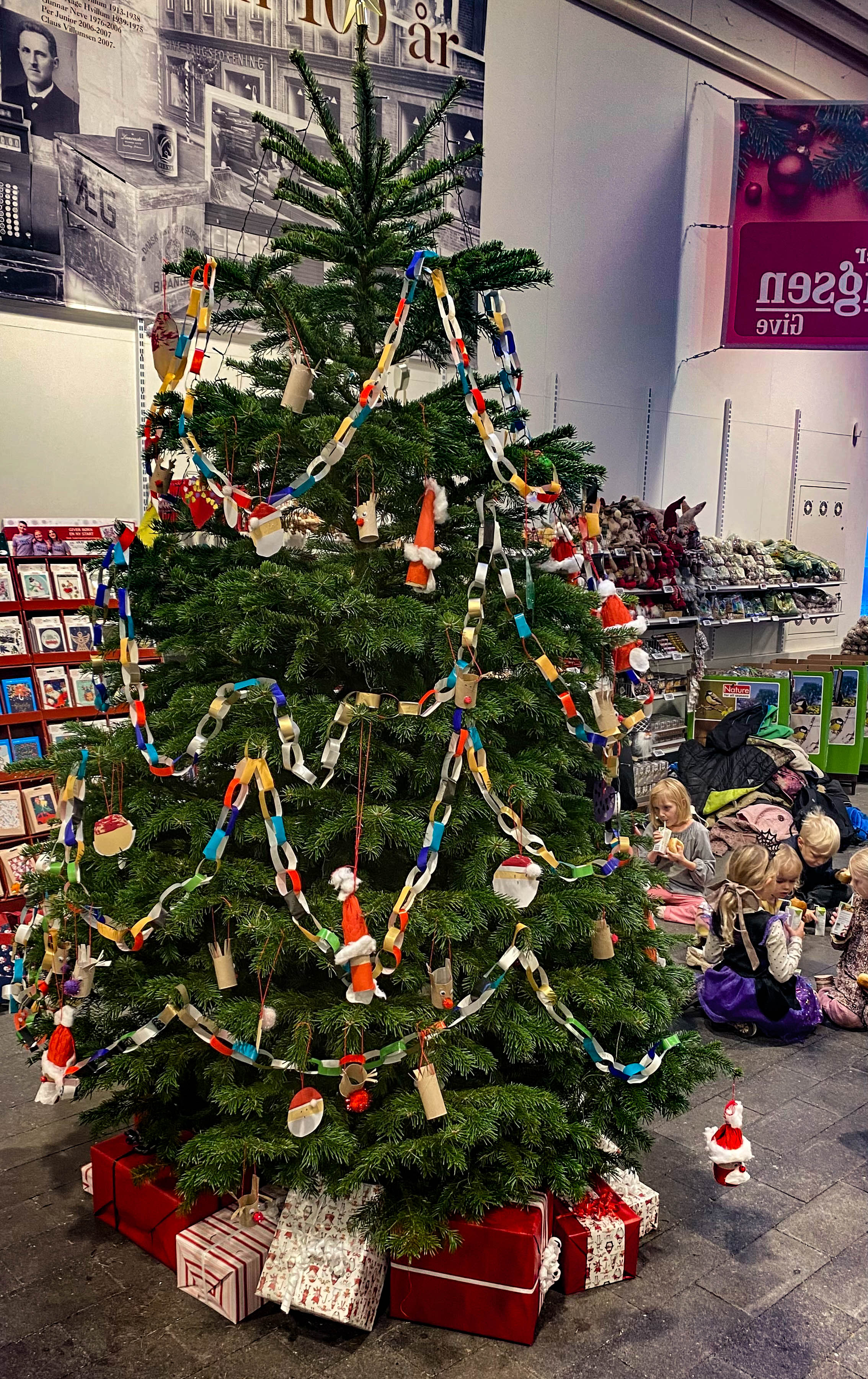 -Da vi fik buddet på at levere julepynten til juletræet, sagde vi selvfølgelig straks ja. Det er en rigtig fin opgave for vores Sommerfugle, vores 5-årige førskolebørn, som jo kan rigtig mange ting selv. De er gået til sagen med stor iver, og der er blevet klippet og klistret løs i de her 14 dage, hvor der er også er blevet lavet en rigtig lang guirlande, som har ligget på gangene, indtil den skulle rundt om juletræet i Brugsen. Nu føler vi jo, at vi har et slags ejerskab i juleafdelingen i Brugsen – og det er faktisk ret så hyggeligt, konstaterer Hanne med et stort julesmil.