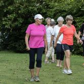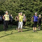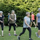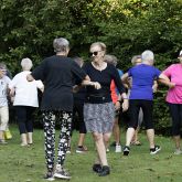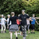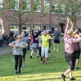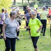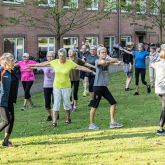 Så går aktiviteterne i gang. Gerda Virkelyst indtager podiet og får de morgenfriske damer og mænd linet op til dagens første øvelse. Her er det Kim Larsen, der lægger musik til, og ved øvelse nr. 2 er det såmænd hyggelige toner Gulddreng, der lyder ud af højtalerne.