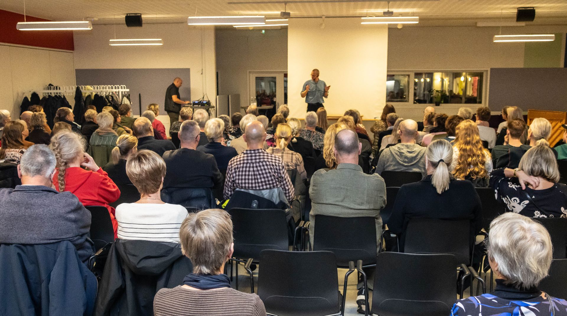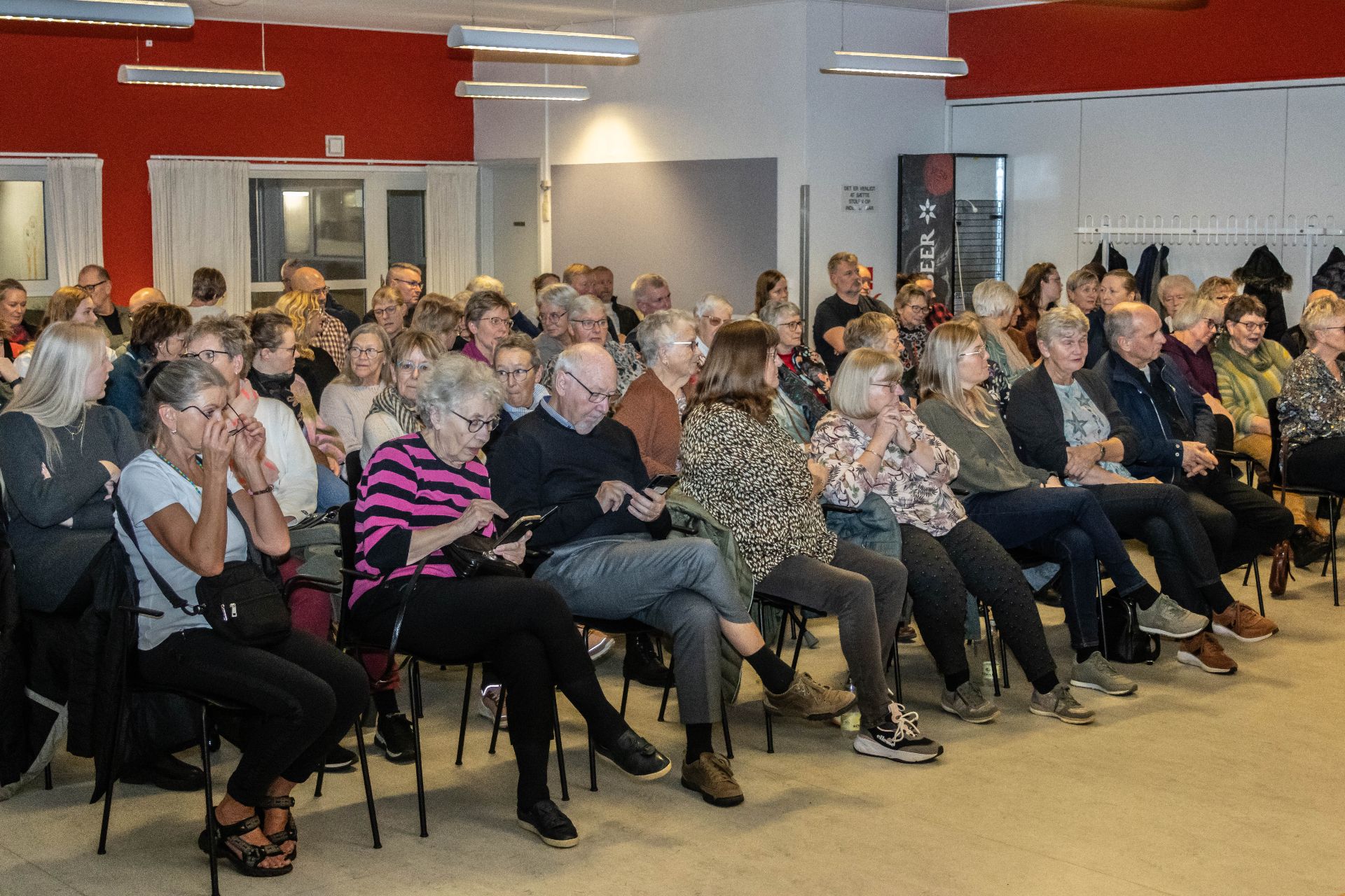 100 tilhørere havde taget plads, da Daniel Rye torsdag aften holdt foredrag i Ikærhallens kantine med Red Barnet som arrangør. Foto: Jim Hoff