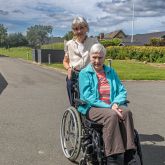 Foto: Plejecenter Meta i Gadbjerg kunne onsdag officielt indvie den nye DUO-elcykel, som 'Meta Marie-Hjemmets Venner har skaffet penge til. Her ser vi Inga Filsø Thomsen fra Meta Marie-Hjemmets Venner samt beboeren Kaj på cyklen - og de er klar til en testtur. Foto: Jim Hoff