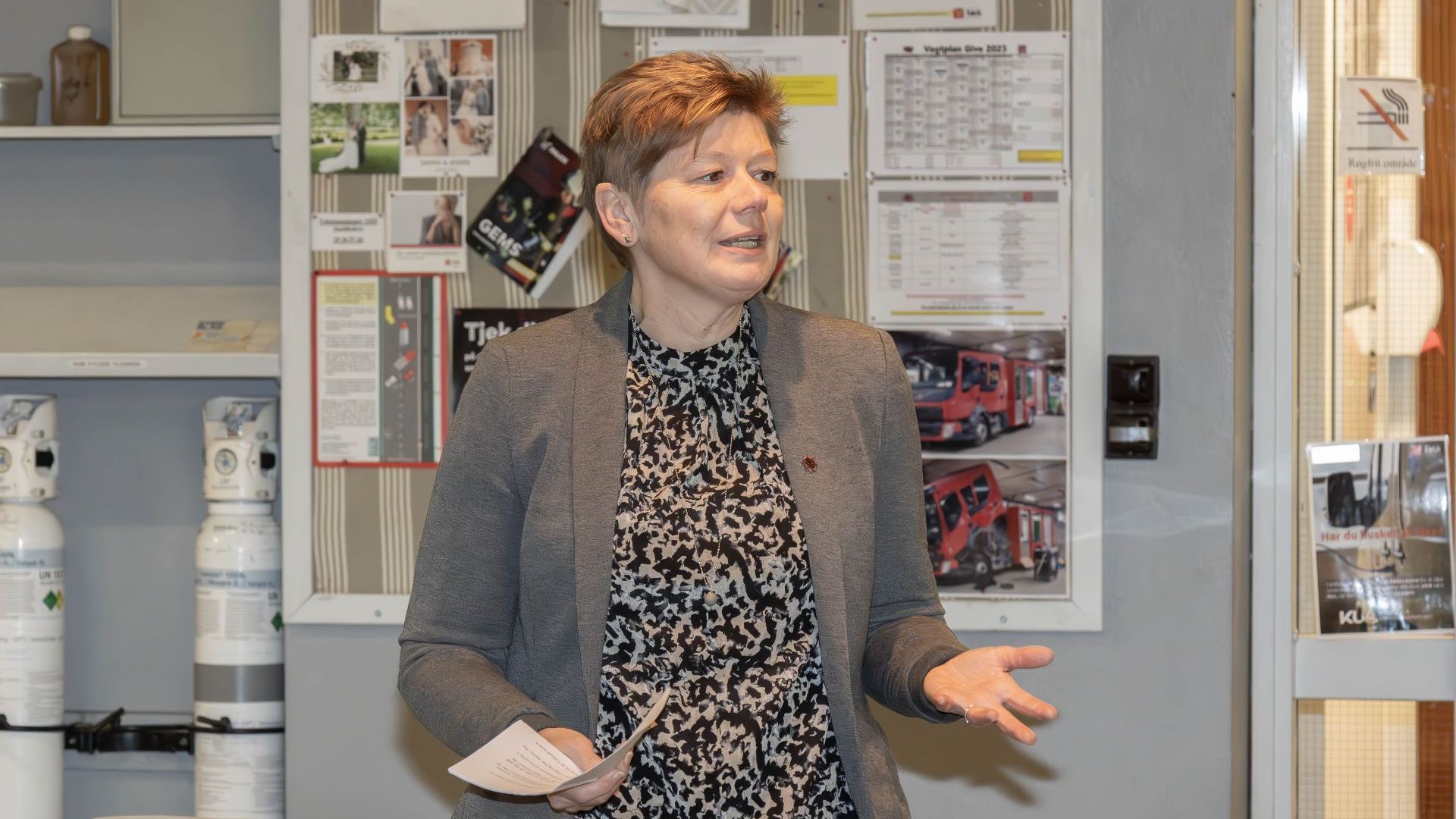 Gerda Jørgensen var på plads som repræsentant for Beredskabskommissionen, og hun takkede blandt andet folkene på stationen i Give for at være med til at skabe en tryg hverdag for borgerne i området. Foto: Jim Hoff