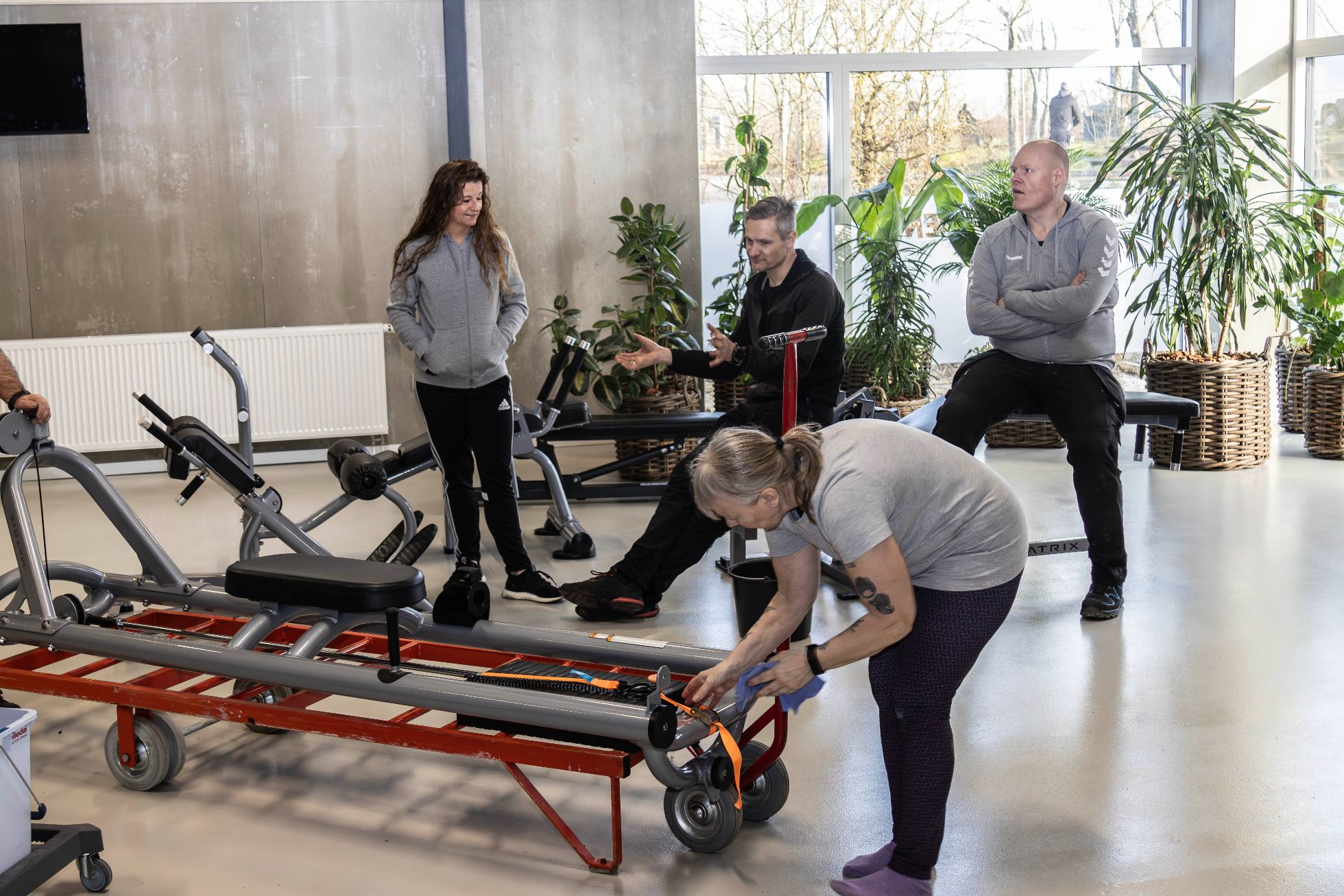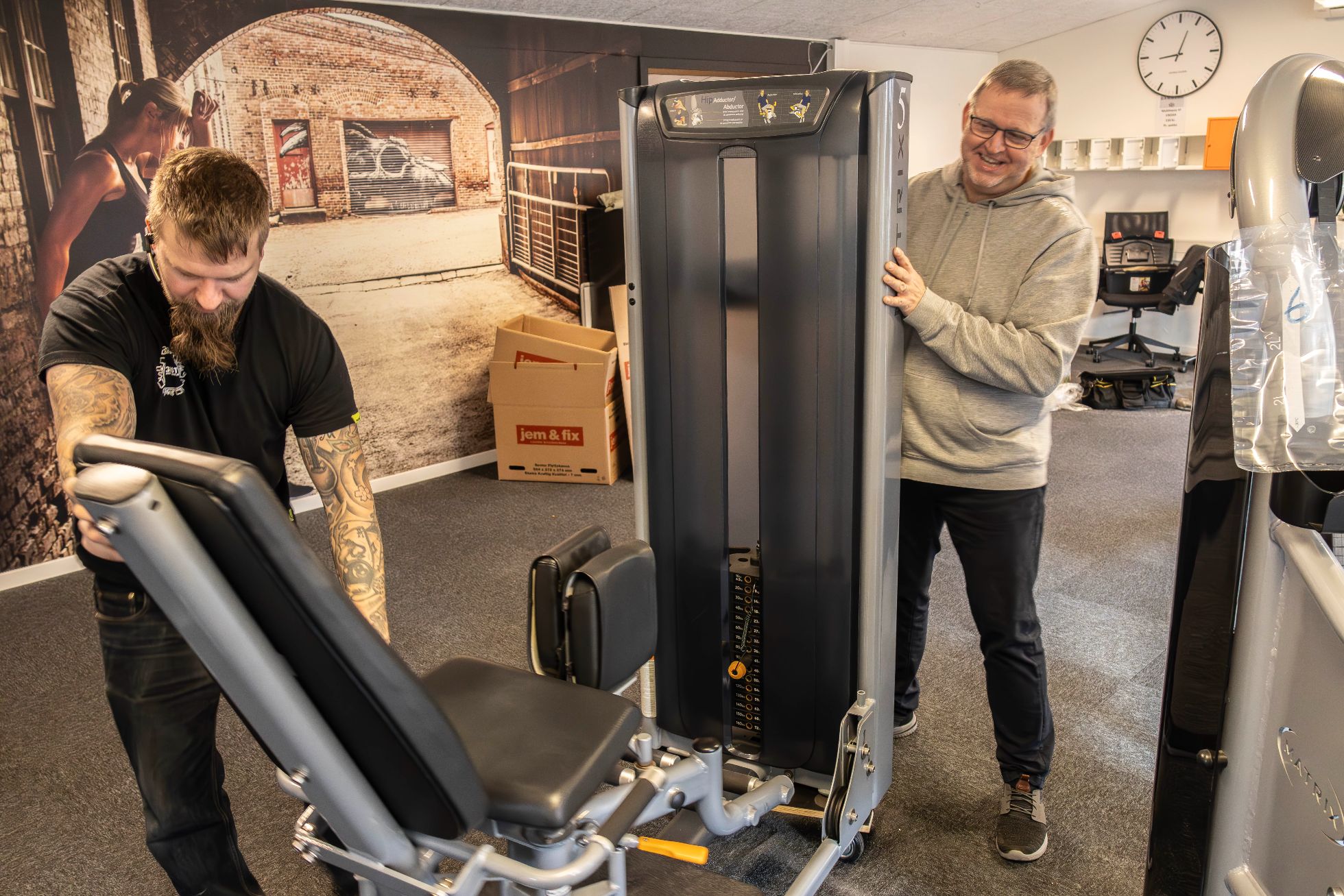 -Vi startede torsdag aften med den første afmontering af tingene i spinningslokalet, og vores centerleder Rikke har været i gang hele ugen med at flytte småting og smide ud osv. Nu samledes vi så her i dag, fredag, klokken 7.00 til rundstykker og kaffe, også er vi ellers gået i gang med at flytte maskiner og træningsudstyr herfra over i vores nye dejlige fitnesscenter, fortælle Jacob, mens et par bomstærke gutter bakser i baggrunden med en større træningsmaskine, der skal bæres ud på en trailer.