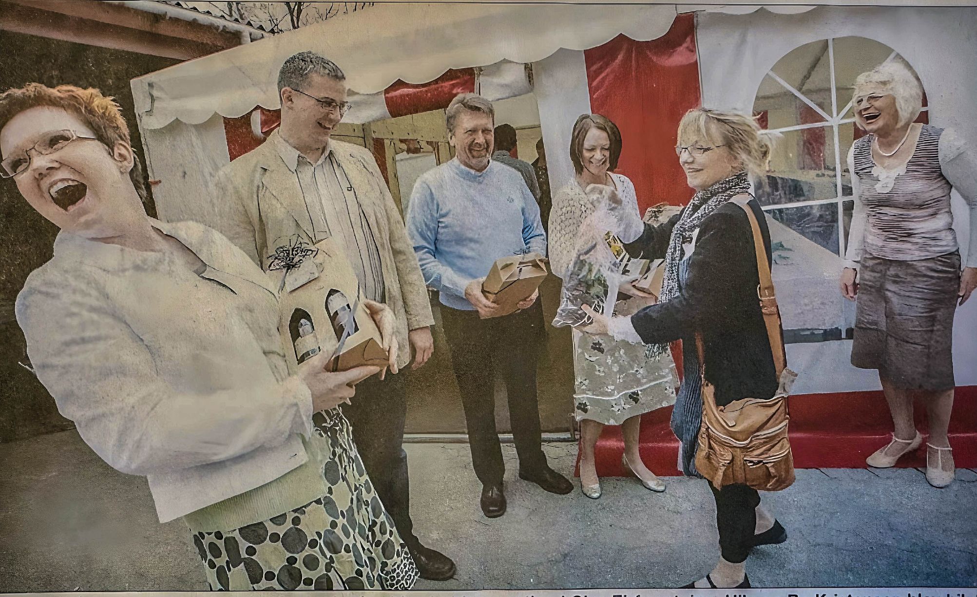 I 2008 overtager Ulla og Bo Kristensen Give El efter Børge og Ellen og medindehaver, Dorte, Ellen og Børges datter. Det markeres ved en festlig reception, hvor Handelstandsforeningens daværende formand, Marianne Dragsbæk overrækker gaver til både køber og sælger. Foto venligst udlånt af Børge Westergaard.